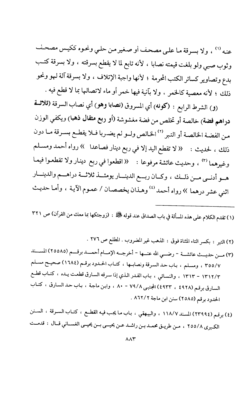 (¬3) من حديث عائشة -رضي اللَّه عنها- أخرجه الإِمام أحمد برقم (25585) المسند 7/ 355، ومسلم، باب حد السرقة ونصابها، كتاب الحدود برقم (1684) صحيح مسلم 3/ 1312 - 1313، والنسائي، باب القدر الذي إذا سرقه السارق قطعت يده، كتاب قطع السارق برقم (4928، 4933) المجتبى 8/ 79 - 80، وابن ماجه، باب حد السارق، كتاب الحدود برقم (2585) سنن ابن ماجه 2/ 862.