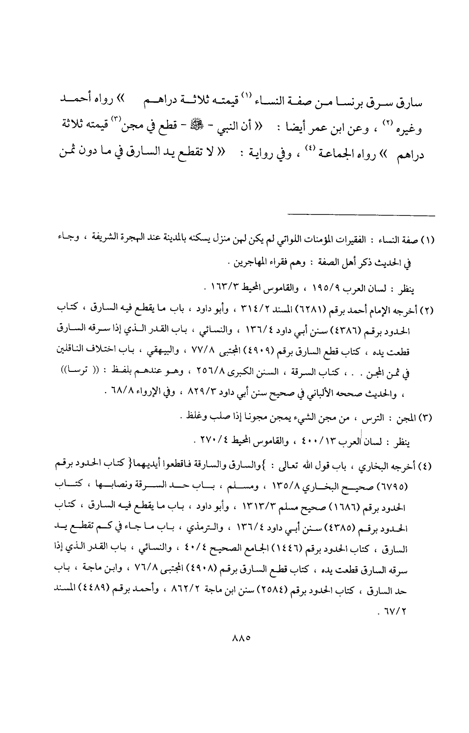 (¬4) أخرجه البخاري، باب قول اللَّه تعالى: {وَالسَّارِقُ وَالسَّارِقَةُ فَاقْطَعُوا أَيْدِيَهُمَا} كتاب الحدود برقم (6795) صحيح البخاري 8/ 135، ومسلم، باب حد السرقة ونصابها، كتاب الحدود برقم (1686) صحيح مسلم 3/ 1313، وأبو داود، باب ما يقطع فيه السارق، كتاب الحدود برقم (4385) سنن أبي داود 4/ 136، والترمذي، باب ما جاء في كم تقطع يد السارق، كتاب الحدود برقم (1446) الجامع الصحيح 4/ 40، والنسائي، باب القدر الذي إذا سرقه السارق قطعت يده، كتاب قطع السارق برقم (4908) المجتبى 8/ 76، وابن ماجه، باب حد السارق، كتاب الحدور برقم (2584) سنن ابن ماجه 2/ 862، وأَحمد برقم (4489) المسند 2/ 67.