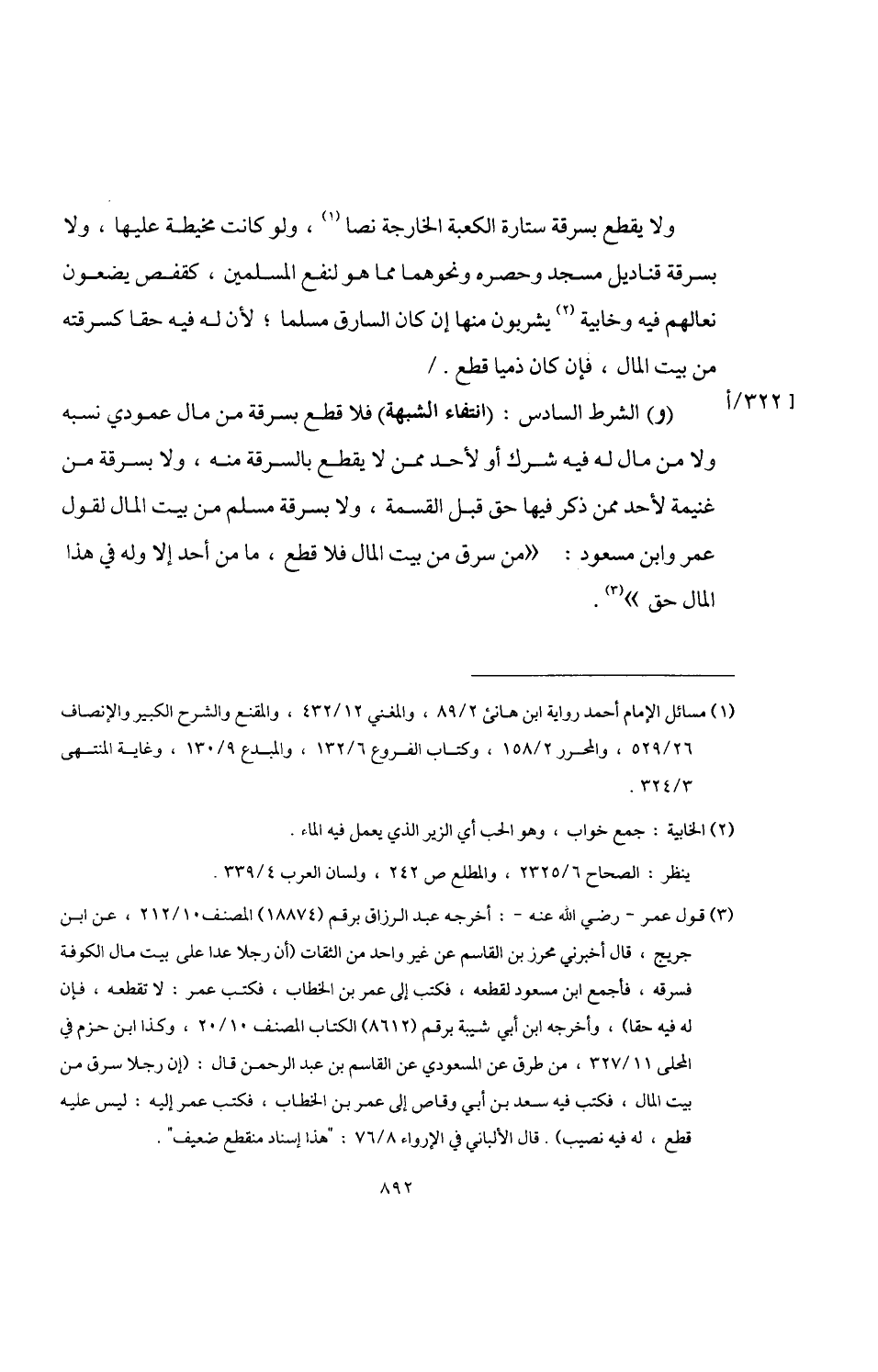 (¬3) قول عمر -رضي اللَّه عنه-: أخرجه عبد الرزاق برقم (18874) المصنف 10/ 212، عن ابن جريج، قال أخبرني محرز بن القاسم عن غير واحد من الثقات (أن رجلا عدا على بيت مال الكوفة فسرقه، فأجمع ابن مسعود لقطعه، فكتب إلى عمر بن الخطاب، فكتب عمر: لا تقطعه، فإن له فيه حقا)، وأخرجه ابن أبي شيبة برقم (8612) الكتاب المصنف 10/ 20، وكذا ابن حزم في المحلى 11/ 327، من طرق عن المسعودي عن القاسم بن عبد الرحمن قالا: (إن رجلا سرق من بيت المال، فكتب فيه سعد بن أبي وقاص إلى عمر بن الخطاب، فكتب عمر إليه: ليس عليه قطع، له فيه نصيب). قال الألباني في الإرواء 8/ 76: "هذا إسناد منقطع ضعيف".