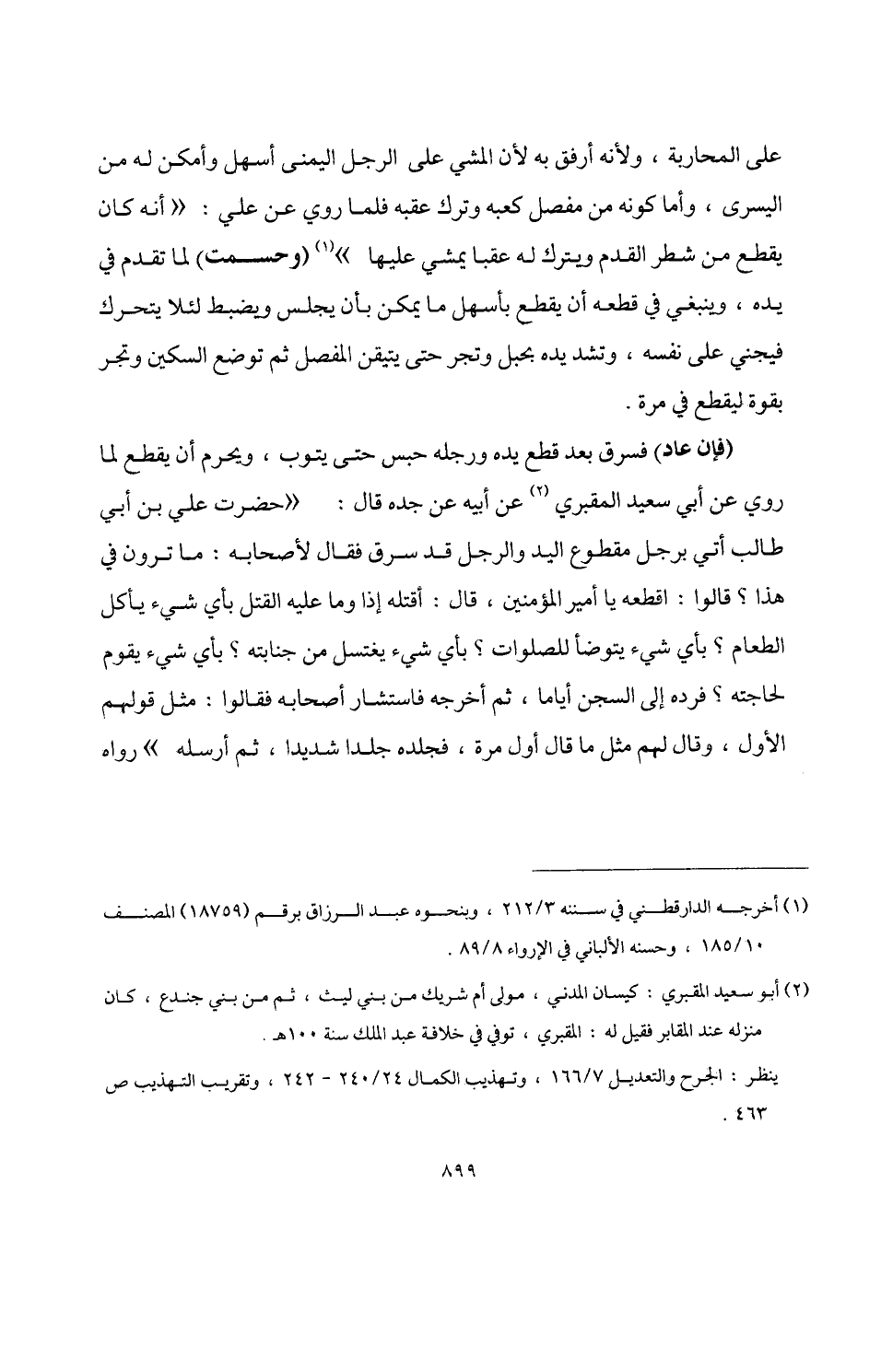 (فإن عاد) فسوق بعد قطع يده ورجله حبس حتى يتوب، ويحرم أن يقطع لما روي عن أبي سعيد المقبري (¬2) عن أَبيه عن جده قال: "حضرت علي بن أبي طالب أتي برجل مقطوع اليد والرجل قد سرق فقال لأصحابه: ما ترون في هذا؟ قالوا: اقطعه يا أمير المؤمنين، قال: أقتله إذا وما عليه القتل بأي شيء يأكل الطعام؟ بأي شيء يتوضأ للصلوات؟ بأي شيء يغتسل من جنابته؟ بأي شيء يقوم لحاجته؟ فرده إلى السجن أيامًا، ثم أخرجه فاستشار أصحابه فقالوا: مثل قولهم الأول، وقال لهم مثل ما قال أول مرة، فجلده جلدًا شديدا، ثم أرسله" رواه