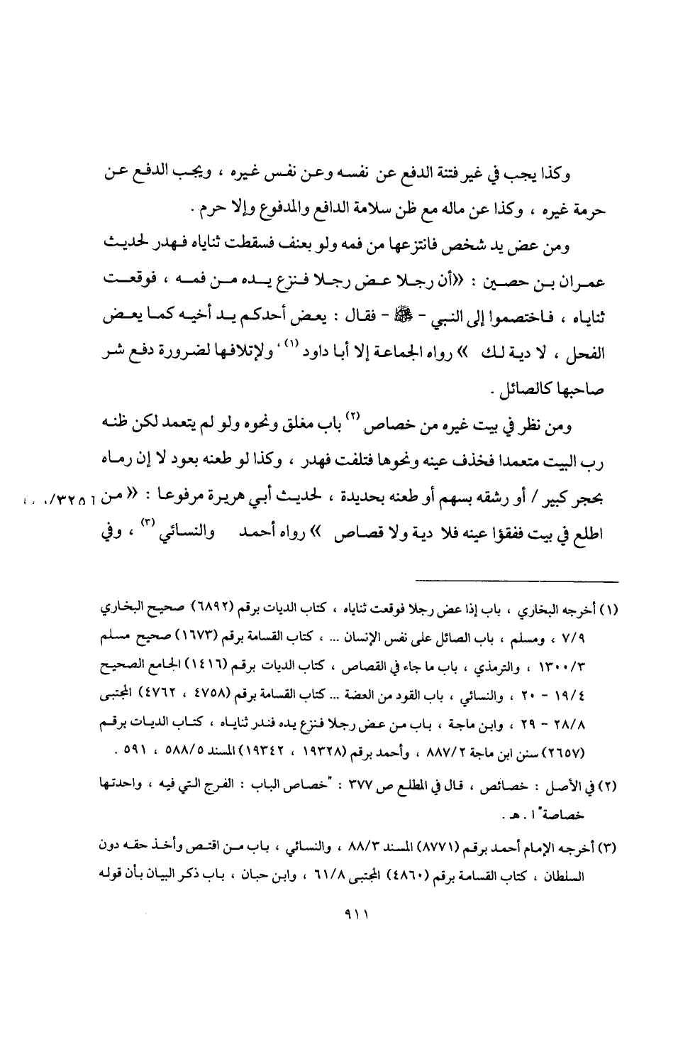 (¬1) أخرجه البخاري، باب إذا عض رجلا فوقعت ثناياه، كتاب الديات برقم (6892) صحيح البخاري 9/ 7، ومسلم، باب الصائل على نفس الإنسان. . .، كتاب القسامة برقم (1673) صحيح مسلم 3/ 1300، والترمذي، باب ما جاء في الفصاص، كتاب الديات برقم (1416) الجامع الصحيح 4/ 19 - 20، والنسائي، باب القود من العضة. . . كتاب القسامة لرقم (4758، 4762) المجتبى 8/ 28 - 29، وابن ماجة، باب من عض رجلا فنزع يده فندر ثناياه، كتاب الديات برقم (2657) سنن ابن ماجة 2/ 887، وأحمد برقم (19328، 19342) المسند 5/ 588، 591.
