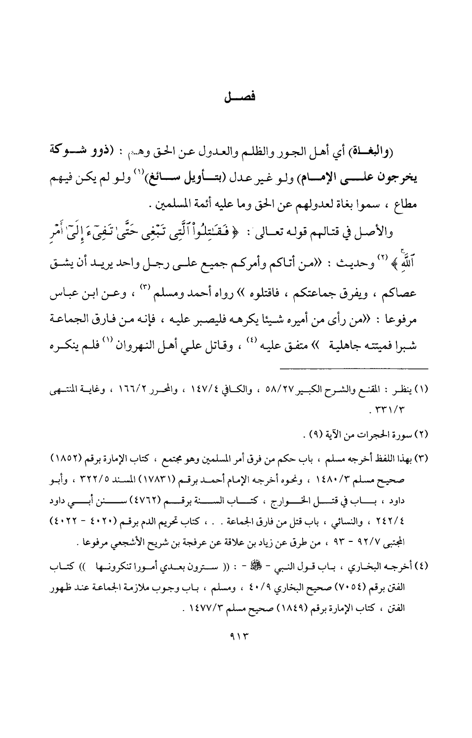 والأصل في قتالهم قوله تعالي: {فَقَاتِلُوا الَّتِي تَبْغِي حَتَّى تَفِيءَ إِلَى أَمْرِ اللَّهِ} (¬2) وحديث: "من أتاكم وأمركم جميع على رجل واحد يريد أن يشق عصاكم، ويفرق جماعتكم، فاقتلوه" رواه أحمد ومسلم (¬3)، وعن ابن عباس مرفوعًا: "من رأى من أميره شيئًا يكرهه فليصبر عليه، فإنه من فارق الجماعة شبرًا فميتته جاهلية" متفق عليه (¬4)، وقاتل علي