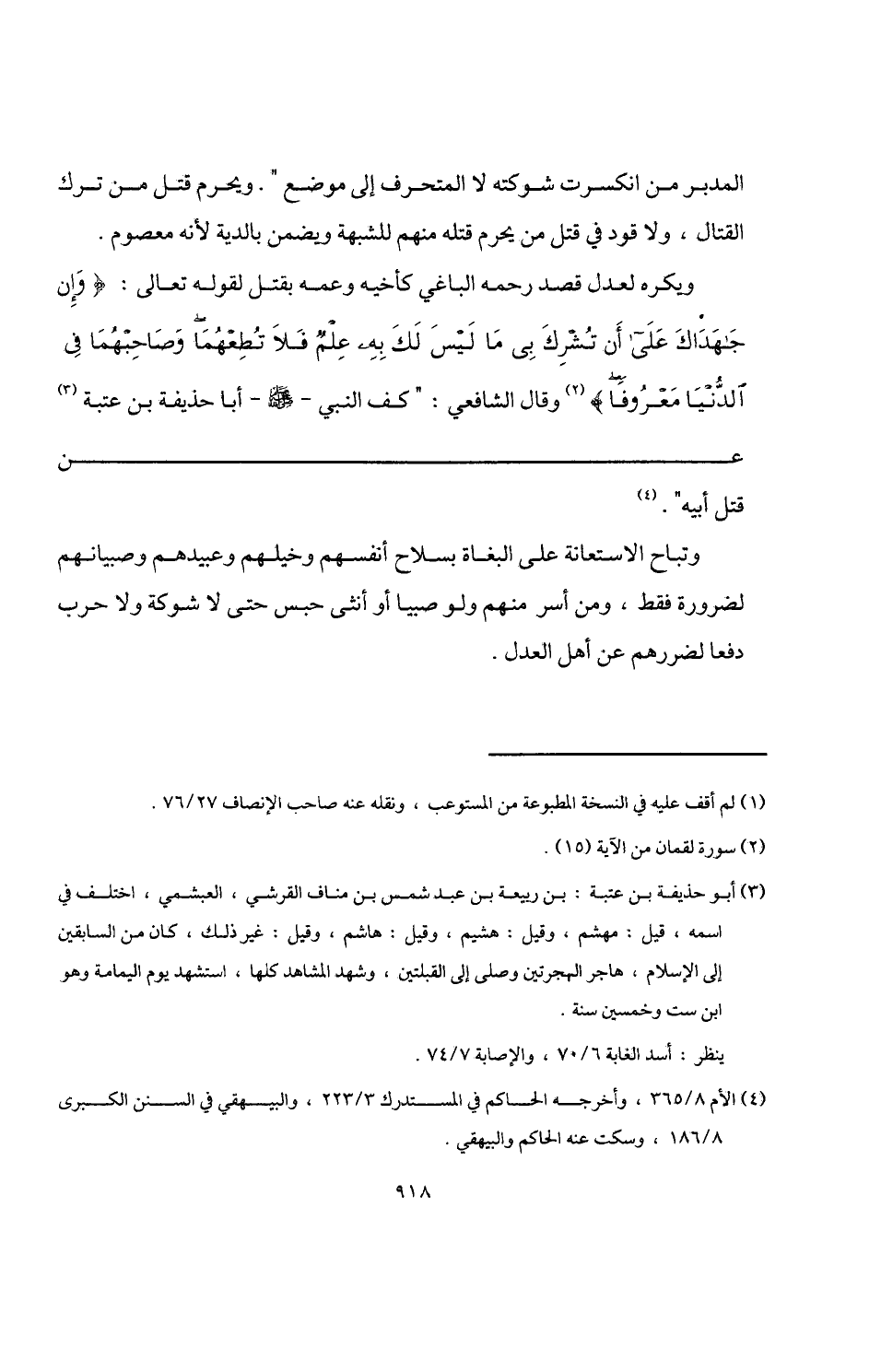 ويكره لعدل قصد رحمه الباغي كأخيه وعمه بقتل لقوله تعالى: {وَإِنْ جَاهَدَاكَ عَلَى أَنْ تُشْرِكَ بِي مَا لَيْسَ لَكَ بِهِ عِلْمٌ فَلَا تُطِعْهُمَا وَصَاحِبْهُمَا فِي الدُّنْيَا مَعْرُوفًا} (¬2) وقال الشافعي: "كف النبي -صلى اللَّه عليه وسلم- أبا حذيفة بن عتبة (¬3) عن قتل أَبيه". (¬4)