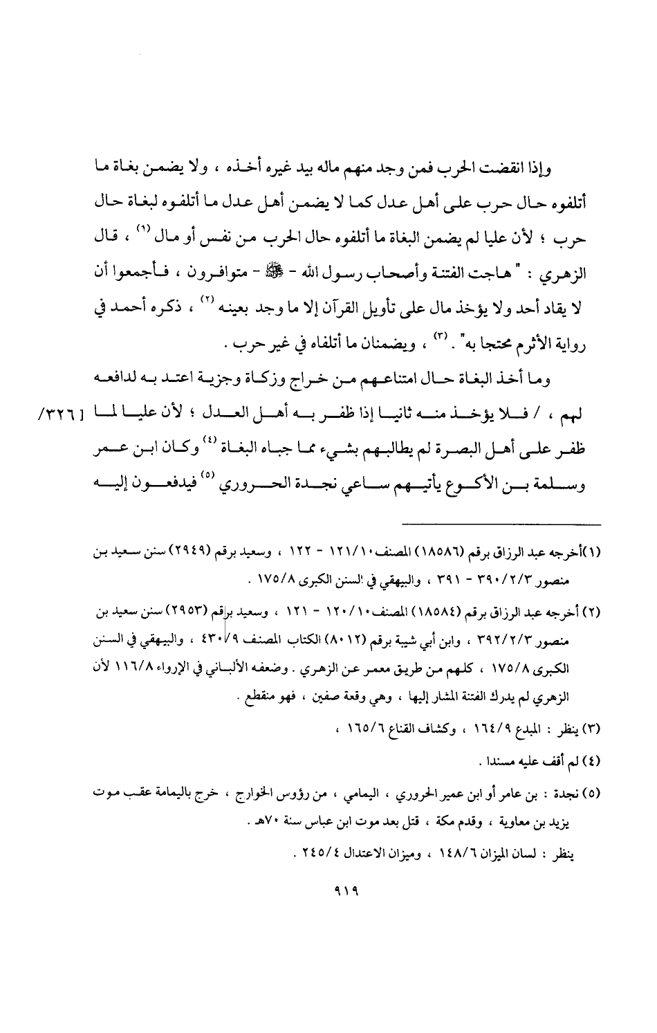 (¬2) أخرجه عبد الرزاق برقم (18584) المصنف 10/ 120 - 121، وسعيد برقم (2953) سنن سعيد بن منصور 3/ 2/ 392، وابن أبي شيبة برقم (8012) الكتاب المصنف 9/ 430، والبيهقي في السنن الكبرى 8/ 175، كلهم من طريق معمر عن الزهري. وضعفه الألباني في الإرواء 8/ 116 لأن الزهري لم يدرك الفتنة المشار إليها، وهي وقعة صفين، فهو منقطع.