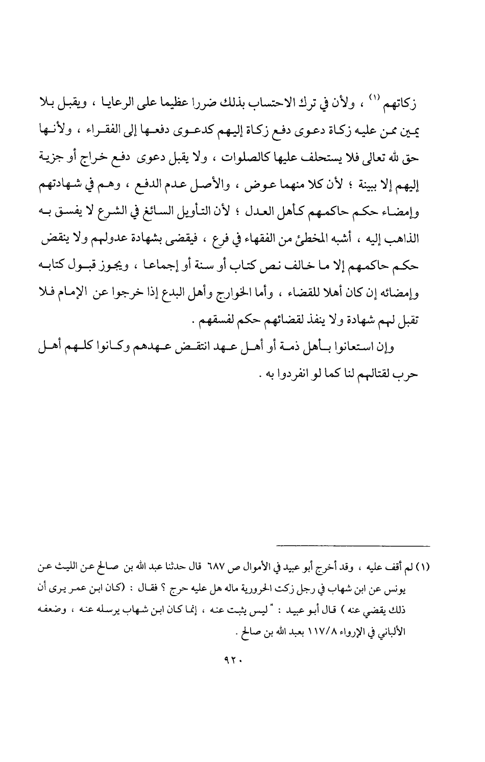 زكاتهم (¬1)، ولأن في ترك الاحتساب بذلك ضررا عظيمًا على الرعايا، ويقبل بلا يمين ممن عليه زكاة دعوى دفع زكاة إليهم كدعوى دفعها إلى الفقراء، ولأنها حق للَّه تعالى فلا يستحلف عليها كالصلوات، ولا يقبل دعوى دفع خراج أو جزية إليهم إلا ببينة؛ لأن كلا منهما عوض، والأصل عدم الدفع، وهم في شهادتهم وإمضاء حكم حاكمهم كأهل العدل؛ لأن التأويل السائغ في الشرع لا يفسق به الذاهب إليه، أشبه المخطئ من الفقهاء في فرع، فيقضى بشهادة عدولهم ولا ينقض حكم حاكمهم إلا ما خالف نص كتاب أوسنة أو إجماعًا، ويجوز قبول كتابه وإمضائه إن كان أهلا للقضاء، وأما الخوارج وأهل البدع إذا خرجوا عن الإِمام فلا تقبل لهم شهادة ولا ينفذ لقضائهم حكم لفسقهم.