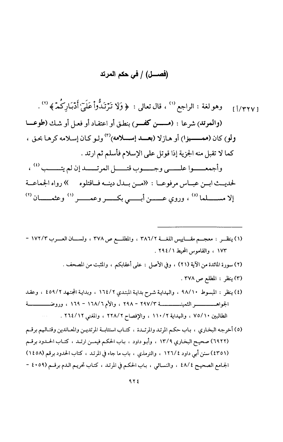 (¬5) أخرجه البخاري، باب حكم المرتد والمرتدة، كتاب استتابة المرتدين والمعاندين وقتالهم برقم (6922) صحيح البخاري 9/ 13، وأبو داود، باب الحكم فيمن ارتد، كتاب الحدود برقم (4351) سنن أبي داود 4/ 126، والترمذي، باب ما جاء في المرتد، كتاب الحدود برقم (1458) الجامع الصحيح 4/ 48، والنسائي، باب الحكم في المرتد، كتاب تحريم الدم برقم (4059 - =