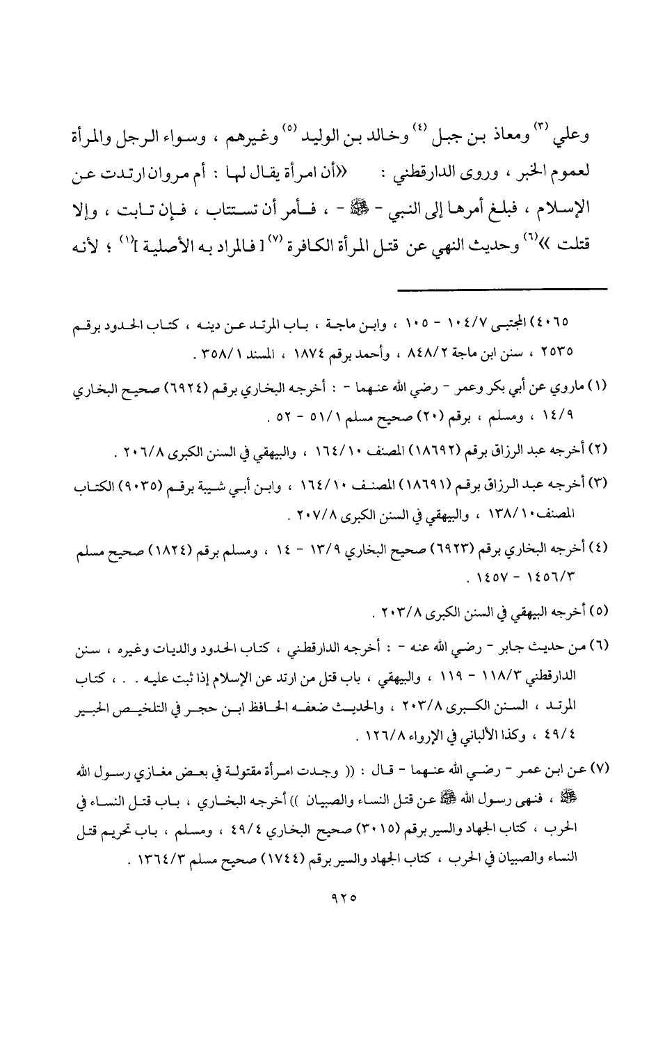 (¬7) عن ابن عمر -رضي اللَّه عنهما- قال: "وجدت امرأة مقتولة في بعض مغازي رسول اللَّه -صلى اللَّه عليه وسلم-، فنهى رسول اللَّه -صلى اللَّه عليه وسلم- عن قتل النساء والصبيان" أخرجه البخاري، باب قتل النساء في الحرب، كتاب الجهاد والسير برقم (3015) صحيح البخاري 4/ 49، ومسلم، باب تحريم قتل النساء والصبيان في الحرب، كتاب الجهاد والسير برقم (1744) صحيح مسلم 3/ 1364.