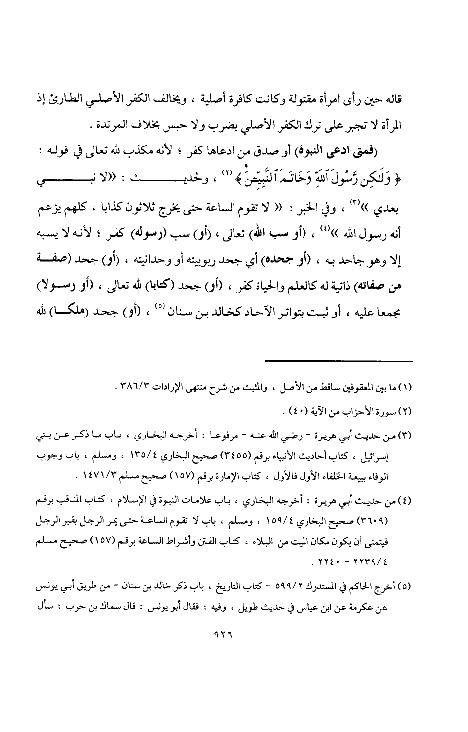 (فمتى ادعى النبوة) أو صدق من ادعاها كفر؛ لأنه مكذب للَّه تعالى في قوله: {وَلَكِنْ رَسُولَ اللَّهِ وَخَاتَمَ النَّبِيِّينَ} (¬1)، ولحديث: "لا نبي بعدي" (¬2)، وفي الخبر: "لا تقوم الساعة حتى يخرج ثلاثون كذابا، كلهم يزعم أنه رسول اللَّه" (¬3)، (أو سب اللَّه) تعالى، (أو) سب (رسوله) كفر؛ لأنه لا يسبه إلا وهو جاحد به، (أو جحده) أي جحد ربوبيته أو وحدانيته، (أو) جحد (صفة من صفاته) ذاتية له كالعلم والحياة كفر، (أو) جحد (كتابًا) للَّه تعالى، (أو رسولا) مجمعًا عليه، أو ثبت بتواتر الآحاد كخالد بن سنان (¬4)، (أو) جحد (ملكًا) للَّه