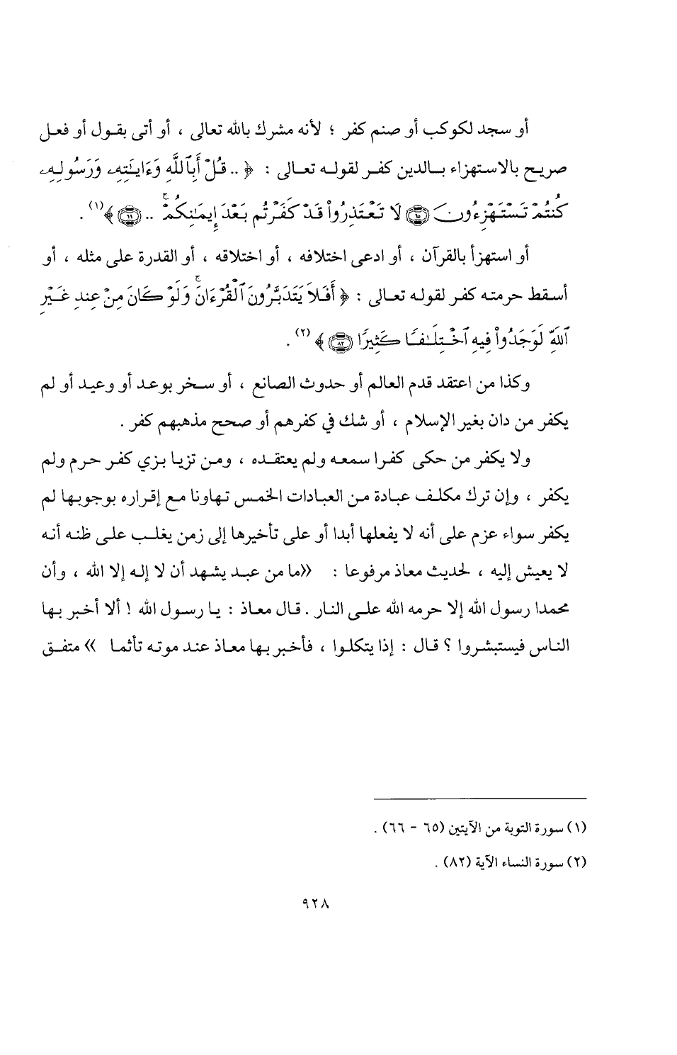 أو استهزأ بالقرآن، أو ادعى اختلافه، أو اختلاقه، أو القدرة على مثله، أو أسقط حرمته كفر لقوله تعالى: {أَفَلَا يَتَدَبَّرُونَ الْقُرْآنَ وَلَوْ كَانَ مِنْ عِنْدِ غَيْرِ اللَّهِ لَوَجَدُوا فِيهِ اخْتِلَافًا كَثِيرًا (82)} (¬2).