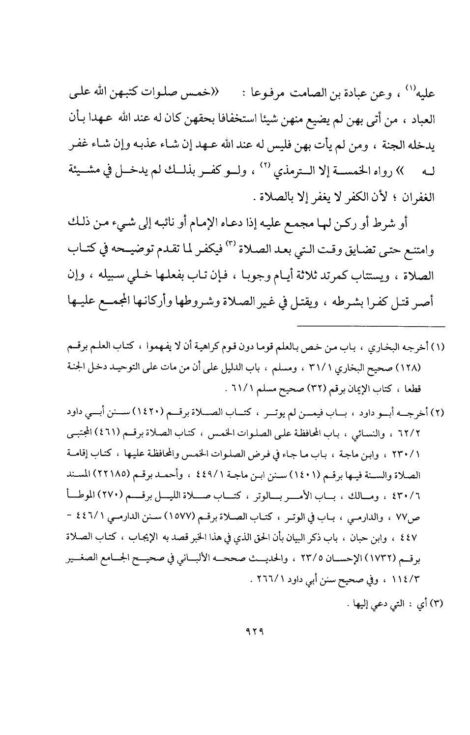 عليه (¬1)، وعن عبادة بن الصامت مرفوعًا: "خمس صلوات كتبهن اللَّه على العباد، من أتى بهن لم يضيع منهن شيئًا استخفافًا بحقهن كان له عند اللَّه عهدا بأن يدخله الجنة، ومن لم يأت بهن فليس له عند اللَّه عهد إن شاء عذبه وإن شاء غفر له" رواه الخمسة إلا الترمذي (¬2)، ولو كفر بذلك لم يدخل في مشيئة الغفران؛ لأن الكفر لا يغفر إلا بالصلاة.