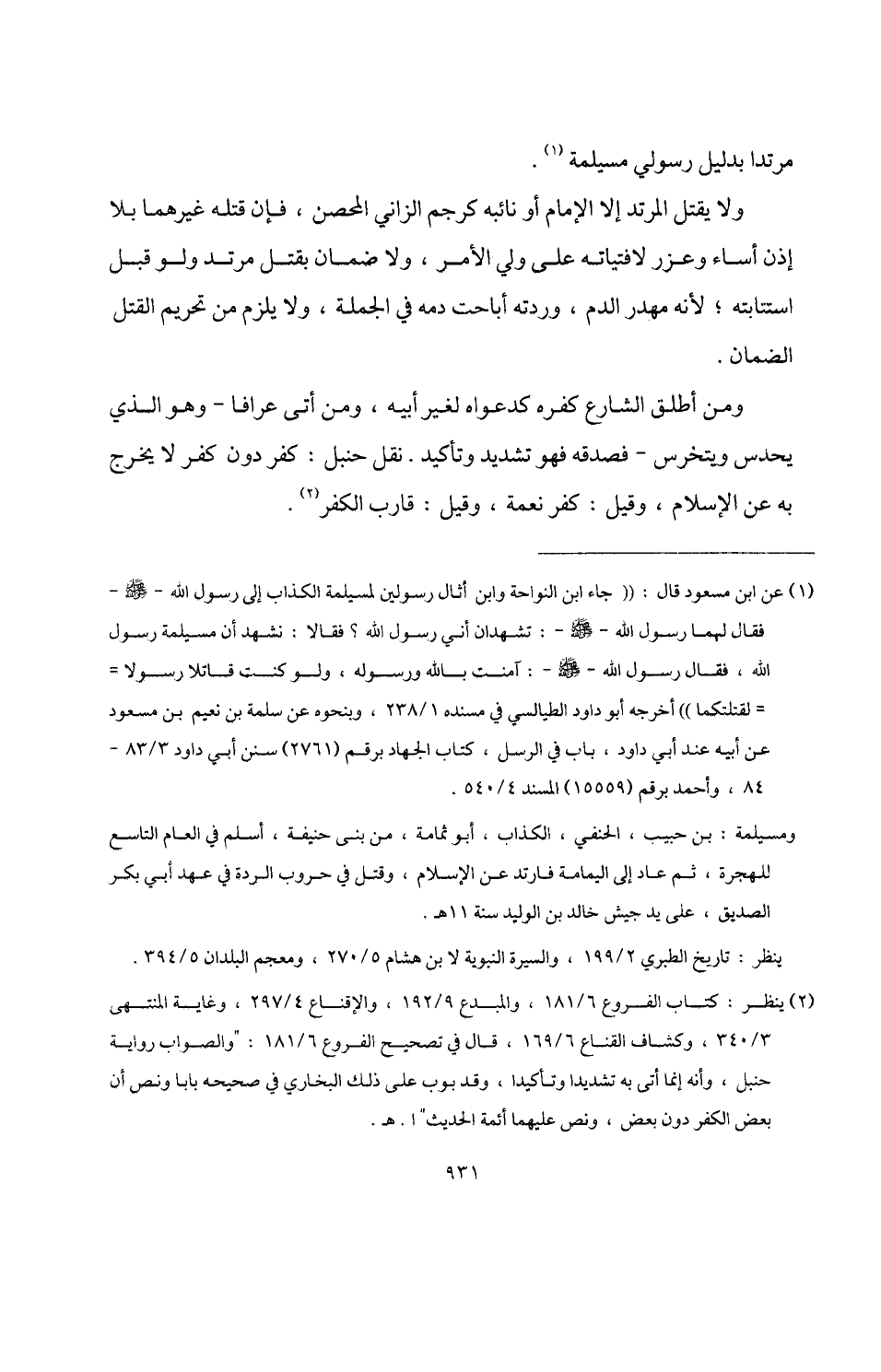 (¬1) عن ابن مسعود قال: "جاء ابن النواحة وابن أثال رسولين لمسيلمة الكذاب إلى رسول اللَّه -صلى اللَّه عليه وسلم- فقال لهما رسول اللَّه -صلى اللَّه عليه وسلم-: تشهدان أني رسول اللَّه؟ فقالا: نشهد أن مسيلمة رسول اللَّه، فقال رسول اللَّه -صلى اللَّه عليه وسلم-: آمنت باللَّه ورسوله، ولو كنت قاتلا رسولا لقتلتكما" أخرجه أبو داود الطيالسي في مسنده 1/ 238، وبنحوه عن سلمة بن نعيم بن مسعود عن أبيه عند أبي داود، باب في الرسل، كتاب الجهاد برقم (2761) سنن أبي داود 3/ 83 - 84، وأحمد برقم (15559) المسند 4/ 540.