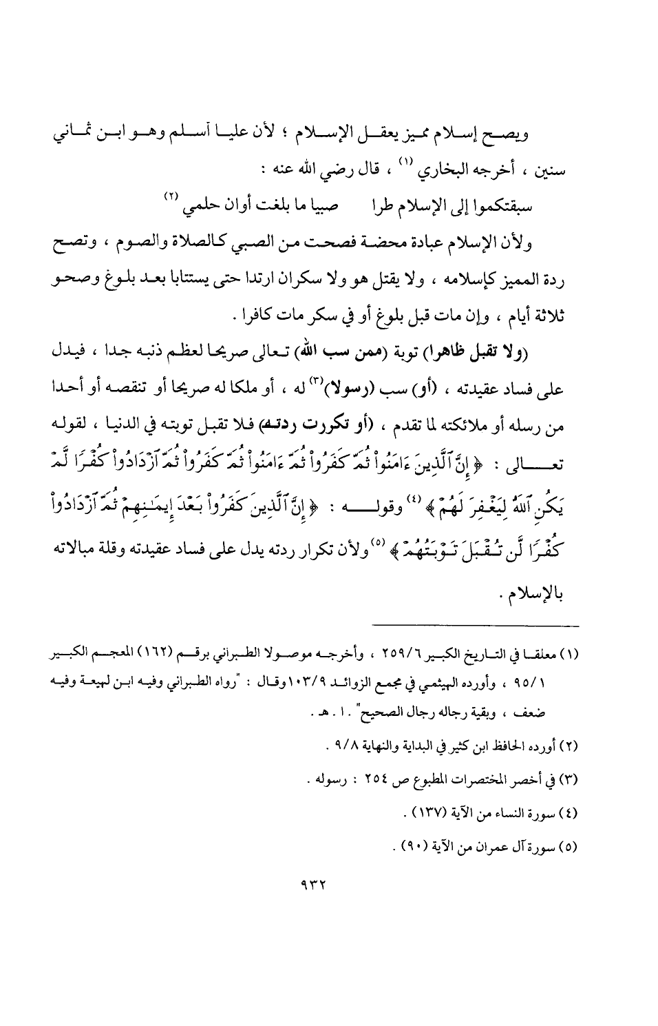(ولا تقبل ظاهرا) توية (ممن سب اللَّه) تعالى صريحا لعظم ذنبه جدا، فيدل على فساد عقيدته، (أو) سب (رسولا) (¬3) له، أو ملكا له صريحا أو تنقصه أو أحدا من رسله أو ملائكته لما تقدم، (أو تكررت ردته) فلا تقبل توبته في الدنيا، لقوله تعالى: {إِنَّ الَّذِينَ آمَنُوا ثُمَّ كَفَرُوا ثُمَّ آمَنُوا ثُمَّ كَفَرُوا ثُمَّ ازْدَادُوا كُفْرًا لَمْ يَكُنِ اللَّهُ لِيَغْفِرَ لَهُمْ} (¬4) وقوله: {إِنَّ الَّذِينَ كَفَرُوا بَعْدَ إِيمَانِهِمْ ثُمَّ ازْدَادُوا كُفْرًا لَنْ تُقْبَلَ تَوْبَتُهُمْ} (¬5) ولأن تكرار ردته يدل على فساد عقيدته وقلة مبالاته بالإسلام.