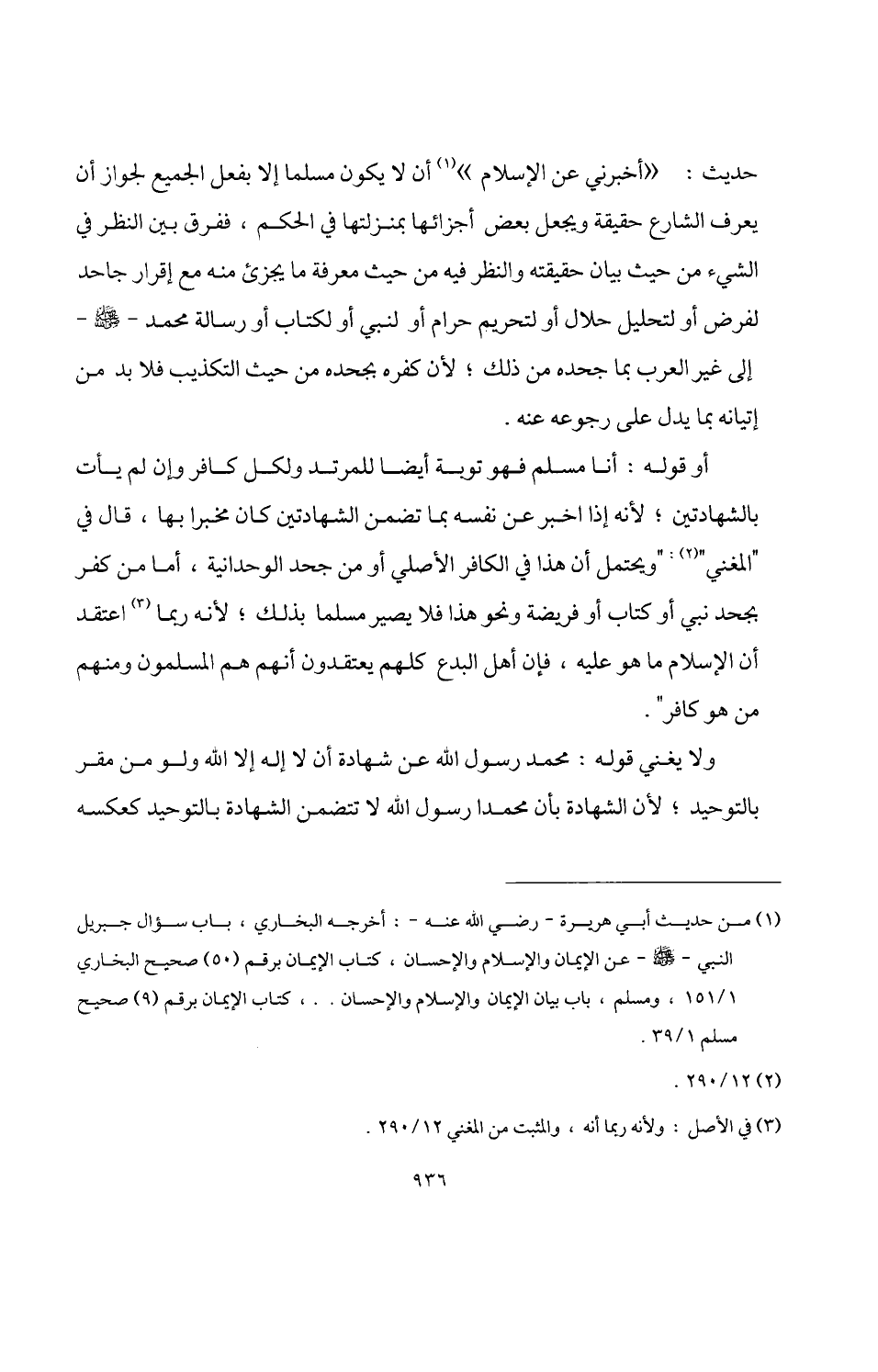 حديث: "أخبرني عن الإسلام" (¬1) أن لا يكون مسلما إلا بفعل الجميع لجواز أن يعرف الشارع حقيقة ويجعل بعض أجزائها بمنزلتها في الحكم، ففرق بين النظر في الشيء من حيث بيان حقيقته والنظر فيه من حيث معرفة ما يجزئ منه مع إقرار جاحد لفرض أو لتحليل حلال أو لتحريم حرام أو لنبي أو لكتاب أو رسالة محمد -صلى اللَّه عليه وسلم- إلى غير العرب بما جحده من ذلك؛ لأن كفره بجحده من حيث التكذيب فلا بد من إتيانه بما يدل على رجوعه عنه.