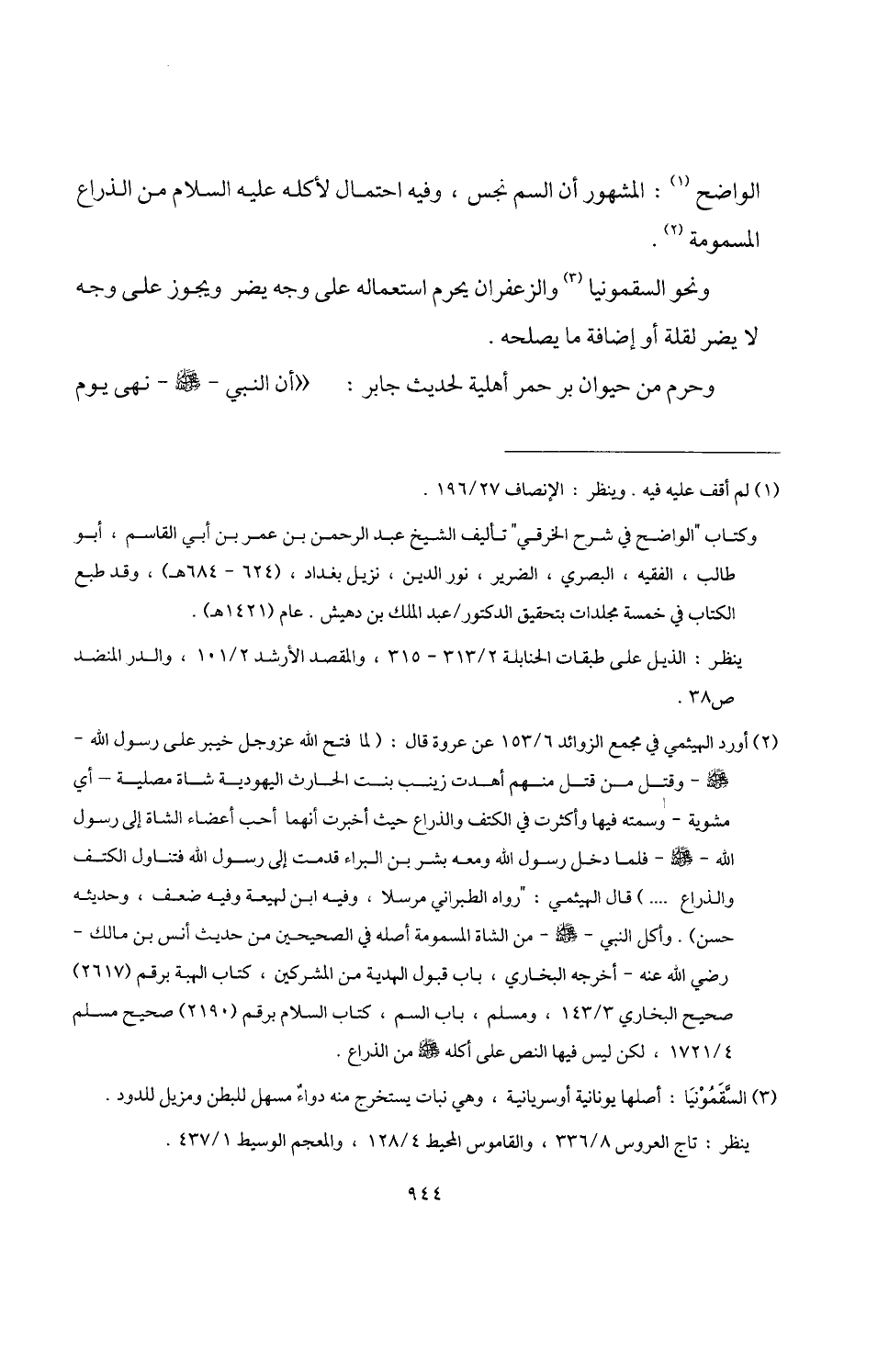 (¬2) أورد الهيثمي في مجمع الزوائد 6/ 153 عن عروة قال: "لما فتح اللَّه عز وجل خيبر على رسول اللَّه -صلى اللَّه عليه وسلم- وقتل من قتل منهم أهدت زينب بنت الحارث اليهورية شاة مصلية -أي مشوية- وسمته فيها وأكثرت في الكتف والذراع حيث أخبرت أنهما أحب أعضاء الشاة إلى رسول اللَّه -صلى اللَّه عليه وسلم- فلما دخل رسول اللَّه ومعه بشر بن البراء قدمت إلى رسول اللَّه فتناول الكتف والذراع. . .) قال الهيثمي: "رواه الطبراني مرسلا، وفيه ابن لهيعة وفيه ضعف، وحديثه حسن). وأكل النبي -صلى اللَّه عليه وسلم- من الشاة المسمومة أصله في الصحيحين من حديث أنس بن مالك -رضي اللَّه عنه- أخرجه البخاري، باب قبول الهدية من المشركين، كتاب الهبة برقم (2617) صحيح البخاري 3/ 143، ومسلم، باب السم، كتاب السلام برقم (2198) صحيح مسلم 4/ 1721، لكن ليس فيها النص على أكله -صلى اللَّه عليه وسلم- من الذراع.