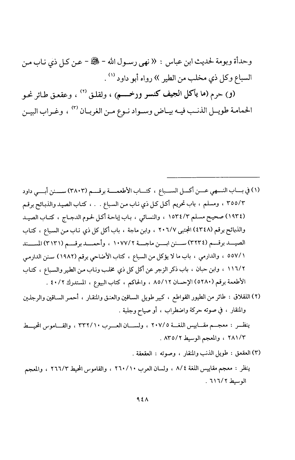 (¬1) في باب النهي عن أكل السباع، كتاب الأطعمة برقم (3803) سنن أبي داود 3/ 355، ومسلم، باب تحريم أكل كل ذي ناب من السباع. .، كتاب الصيد والذبائح برقم (1934) صحيح مسلم 3/ 1534، والنسائي، باب إباحة أكل لحوم الدجاج، كتاب الصيد والذبائح برقم (4348) المجتبى 7/ 206، وابن ماجة، باب أكل كل ذي ناب من السباع، كتاب الصيد برقم (3234) سنن ابن ماجة 2/ 1077، وأحمد برقم (3131) المسند 1/ 557، والدارمي، باب ما لا يؤكل من السباع، كتاب الأضاحي برقم (1982) سنن الدارمي 2/ 116، وابن حبان، باب ذكر الزجر عن أكل كل ذي مخلب وناب من الطير والسباع، كتاب الأطعمة برقم (5280) الإحسان 12/ 85، والحاكم، كتاب البيوع، المستدرك 2/ 40.