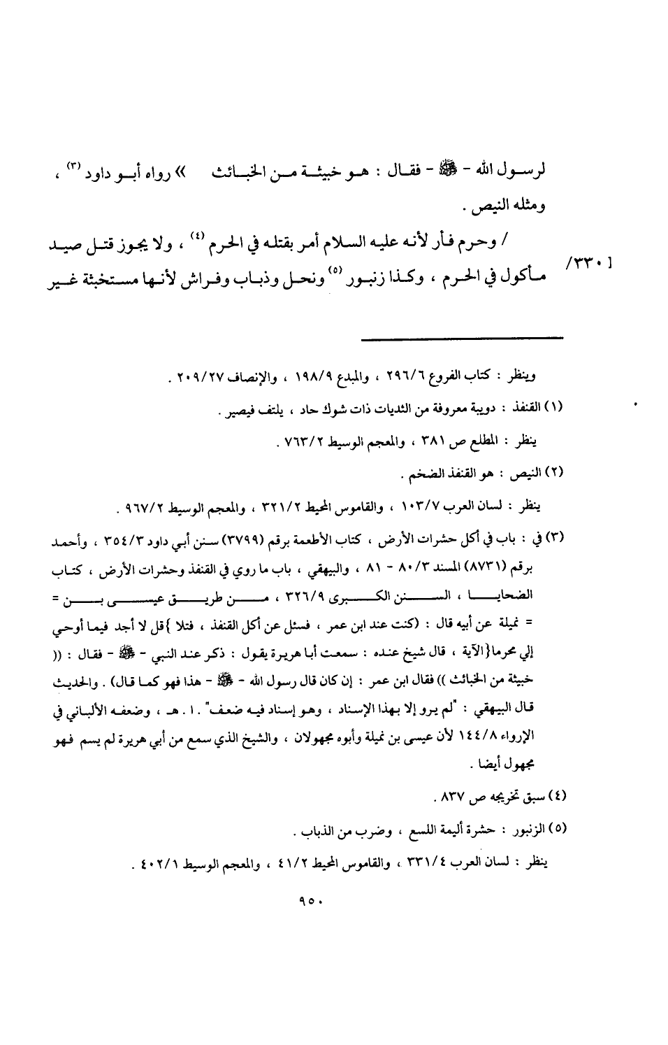 (¬1) في: باب في أكل حشرات الأرض، كتاب الأطعمة برقم (3799) سنن أبي داود 3/ 354، وأحمد برقم (8731) المسند 3/ 80 - 81، والبيهقي، باب ما روي في القنفذ وحشرات الأرض، كتاب الضحايا، السنن الكبرى 9/ 326، من طريق عيسى بن نميلة عن أبيه قال: (كنت عند ابن عمر، فسئل عن أكل القنفذ، فتلا {قُلْ لَا أَجِدُ فِي مَا أُوحِيَ إِلَيَّ مُحَرَّمًا} الآية، قال شيخ عنده: سمعت أبا هريرة يقول: ذكر عند النبي -صلى اللَّه عليه وسلم- فقال: "خبيثة من الخبائث" فقال ابن عمر: إن كان قال رسول اللَّه -صلى اللَّه عليه وسلم- هذا فهو كما قال). والحديث قال البيهقي: "لم يرو إلا بهذا الإسناد، وهو إسناد فيه ضعف". ا. هـ، وضعفه الألباني في الإرواء 8/ 144 لأن عيسى بن نميلة وأبوه مجهولان، والشيخ الذي سمع من أبي هريرة لم يسم فهو مجهول أيضا.