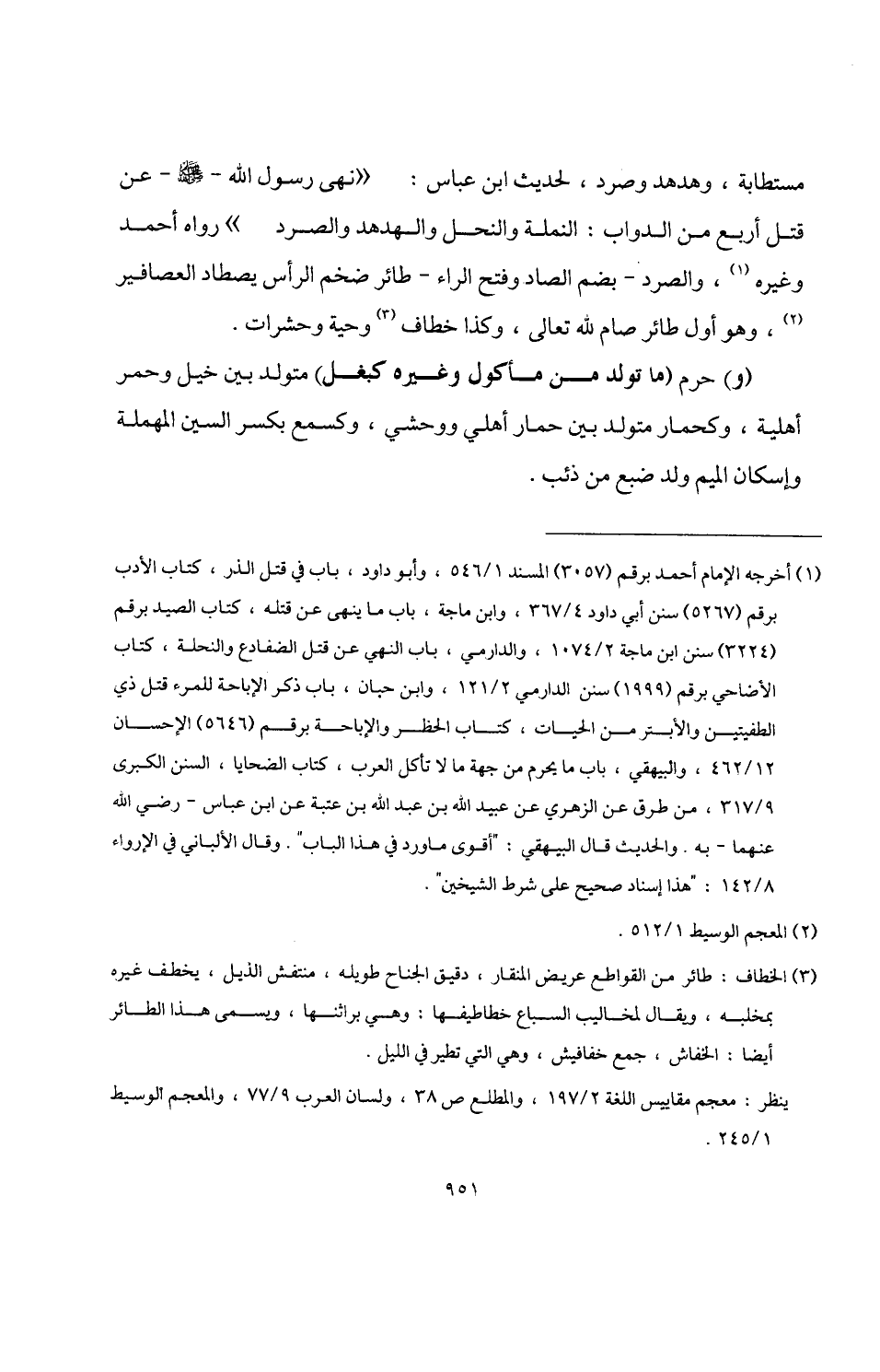 (¬1) أخرجه الإمام أحمد برقم (3057) المسند 1/ 546، وأبو داود، باب في قتل الذر، كتاب الأدب برقم (5267) سنن أبي داود 4/ 367، وابن ماجة، باب ما ينهى عن قتله، كتاب الصيد برقم (3224) سنن ابن ماجة 2/ 1074، والدارمي، باب النهي عن قتل الضفادع والنحلة، كتاب الأضاحي برقم (1999) سنن الدارمي 2/ 121، وابن حبان، باب ذكر الإباحة للمرء قتل ذي الطفيتين والأبتر من الحيات، كتاب الحظر والإباحة برقم (5646) الإحسان 12/ 462، والبيهقي، باب ما يحرم من جهة ما لا تأكل العرب، كتاب الضحايا، السنن الكبرى 9/ 317، من طرق عن الزهري عن عبيد اللَّه بن عبد اللَّه بن عتبة عن ابن عباس -رضي اللَّه عنهما- به. والحديث قال البيهقي: "أقوى ما ورد في هذا الباب". وقال الألباني في الإرواء 8/ 142: "هذا إسناد صحيح على شرط الشيخين".