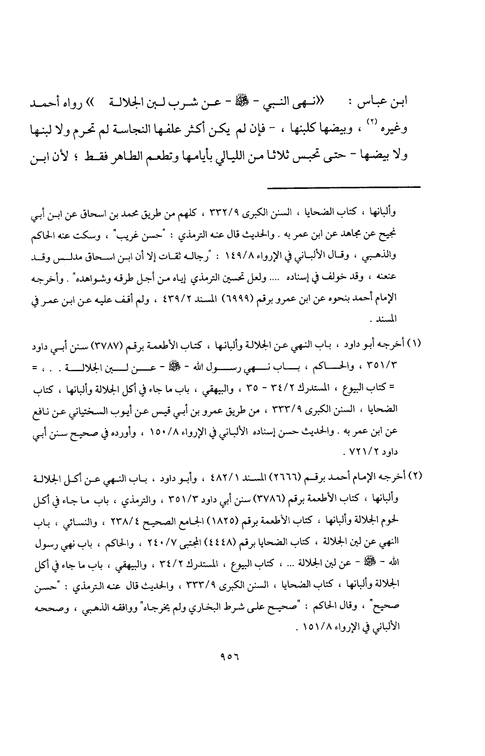 (¬1) أخرجه أبو داود، باب النهي عن الجلالة وألبانها، كتاب الأطعمة برقم (3787) سنن أبي داود 3/ 351، والحاكم، باب نهي رسول اللَّه -صلى اللَّه عليه وسلم- عن لبن الجلالة. .، كتاب البيوع، المستدرك 2/ 34 - 35، والبيهقي، باب ما جاء في أكل الجلالة وألبانها، كتاب الضحايا، السنن الكبرى 9/ 333، من طريق عمرو بن أبي قيس عن أيوب السختياني عن نافع عن ابن عمر به. والحديث حسن إسناده الألباني في الإرواء 8/ 150، وأورده في صحيح سنن أبي داود 2/ 721.