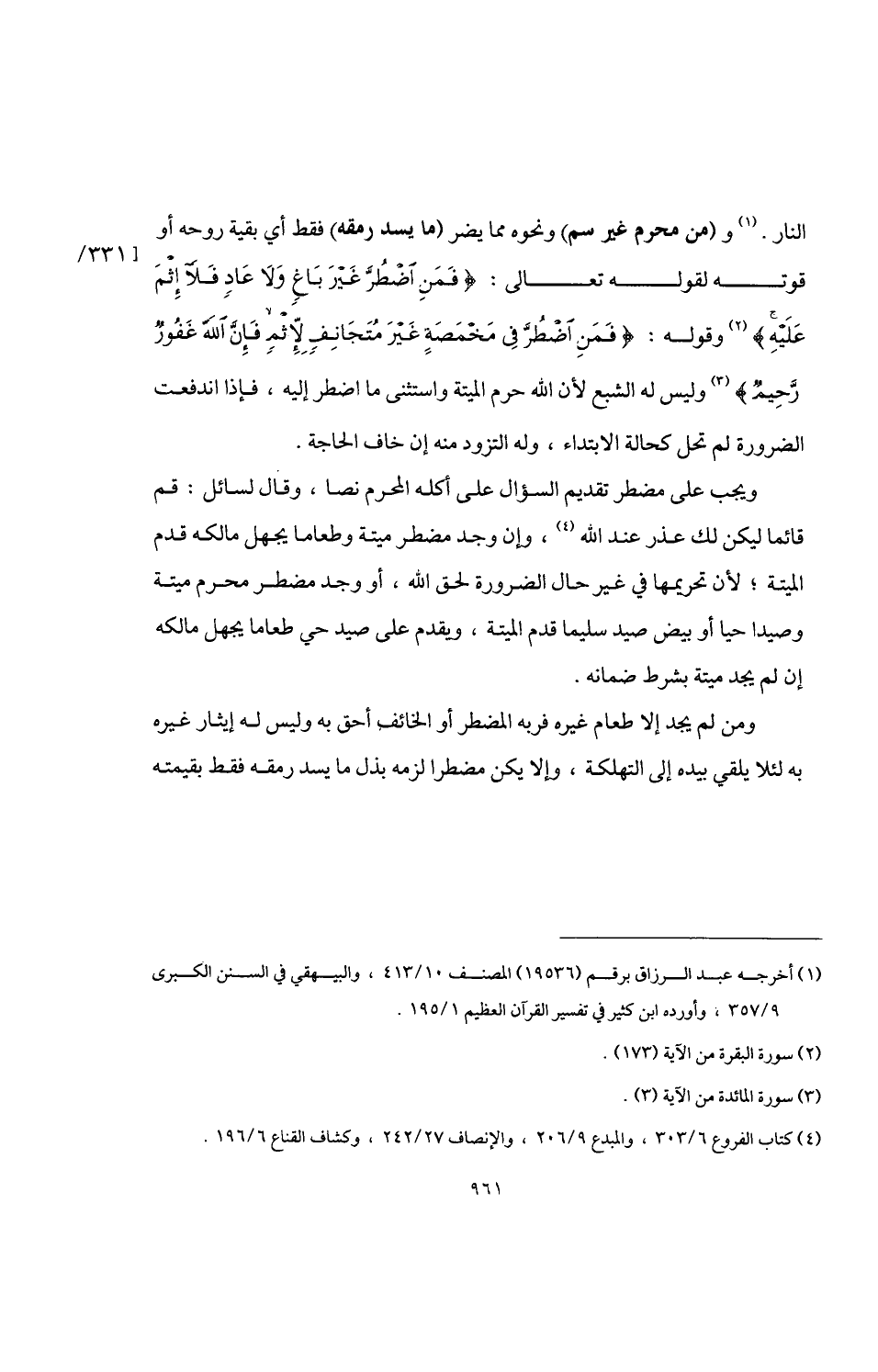 ويجب على مضطر تقديم السؤال على أكله المحرم نصا، وقال لسائل: قم قائما ليكن لك عذر عند اللَّه (¬4)، وإن وجد مضطر ميتة وطعاما يجهل مالكه قدم الميتة؛ لأن تحريمها في غير حال الضرورة لحق اللَّه، أو وجد مضطر محرم ميتة وصيدا حيا أو بيض صيد سليما قدم الميتة، ويقدم على صيد حي طعاما يجهل مالكه إن لم يجد ميتة بشرط ضمانه.