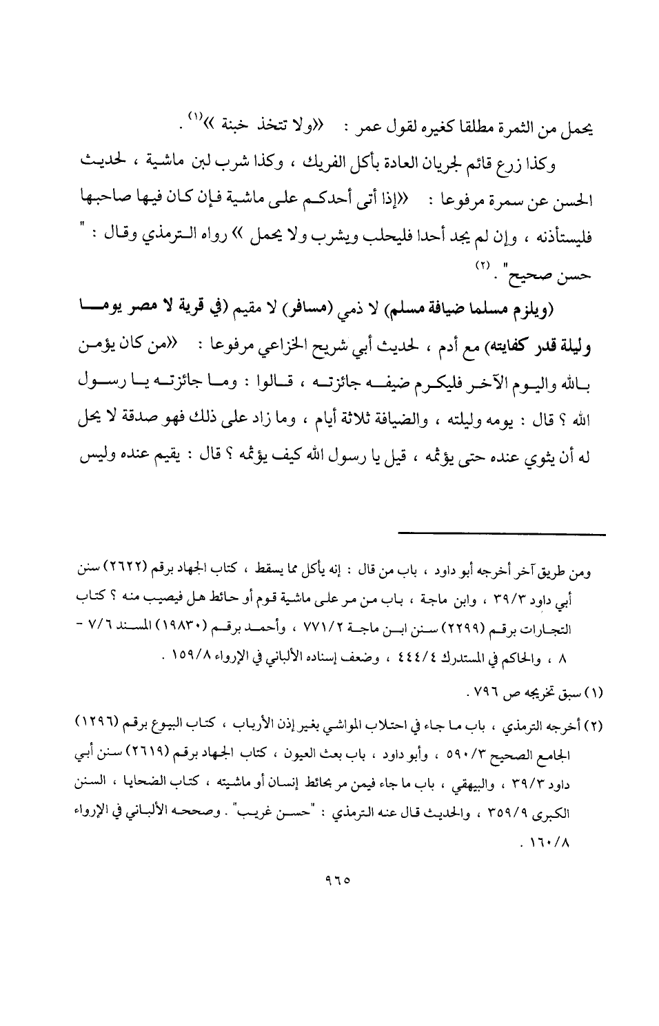 (¬2) أخرجه الترمذي، باب ما جاء في احتلاب المواشي بغير إذن الأرباب، كتاب البيوع برقم (1296) الجامع الصحيح 3/ 590، وأبو داود، باب بعث العيون، كتاب الجهاد برقم (2619) سنن أبي داود 3/ 39، والبيهقي، باب ما جاء فيمن مر بحائط إنسان أو ماشيته، كتاب الضحايا، السنن الكبرى 9/ 359، والحديث قال عنه الترمذي: "حسن غريب". وصححه الألباني في الإرواء 8/ 160.