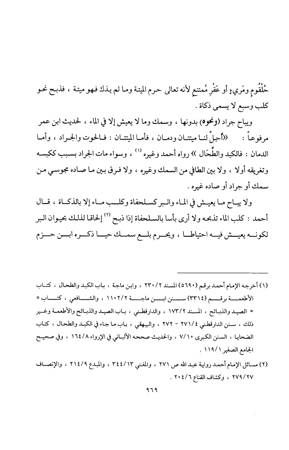 (¬1) أخرجه الإمام أحمد برقم (5690) المسند 2/ 230، وابن ماجة، باب الكبد والطحال، كتاب الأطعمة برقم (3314) سنن ابن ماجة 2/ 1102، والشافعي، كتاب الصيد والذبائح، المسند 2/ 173، والدارقطني، باب الصيد والذبائح والأطعمة وغير ذلك، سنن الدارقطني 4/ 271 - 272، والبيهقي، باب ما جاء في الكبد والطحال، كتاب الضحايا، السنن الكبرى 10/ 7، والحديث صححه الألباني في الإرواء 8/ 164، وفي صحيح الجامع الصغير 1/ 119.