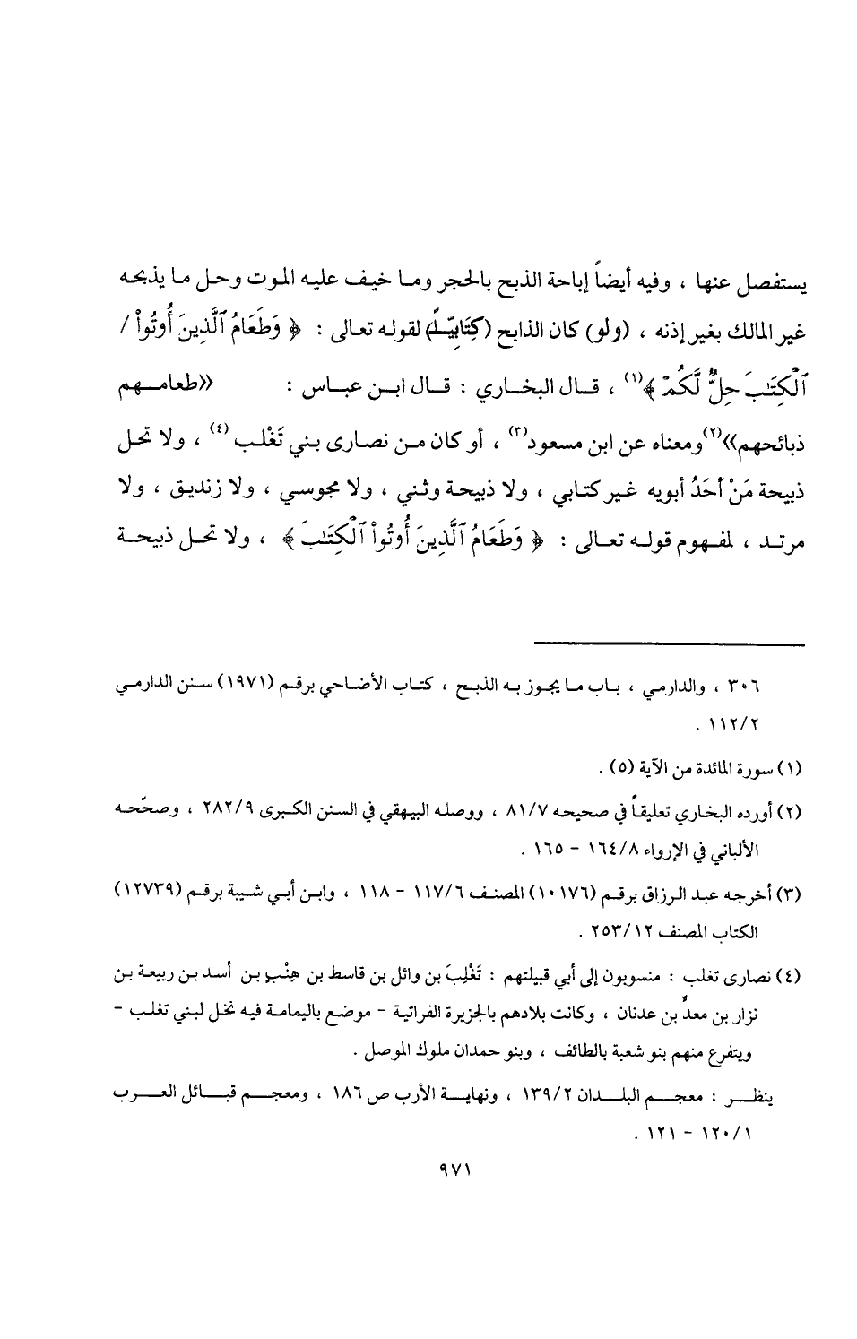 يستفصل عنها، وفيه أيضًا إباحه الذبح بالحجر وما خيف عليه الموت وحل ما يذبحه غير المالك بغير إذنه، (ولو) كان الذابح (كِتَابيًّا) لقوله تعالى: {وَطَعَامُ الَّذِينَ أُوتُوا الْكِتَابَ حِلٌّ لَكُمْ} (¬1)، قال البخاري: قال ابن عباس: "طعامهم ذبائحهم" (¬2) ومعناه عن ابن مسعود (¬3)، أو كان من نصارى بني تَغْلب (¬4)، ولا تحل ذبيحة مَنْ أحَدُ أبويه غير كتابي، ولا ذبيحة وثني، ولا مجوسي، ولا زنديق، ولا مرتد، لمفهوم قوله تعالى: {وَطَعَامُ الَّذِينَ أُوتُوا الْكِتَابَ}، ولا تحل ذبيحة