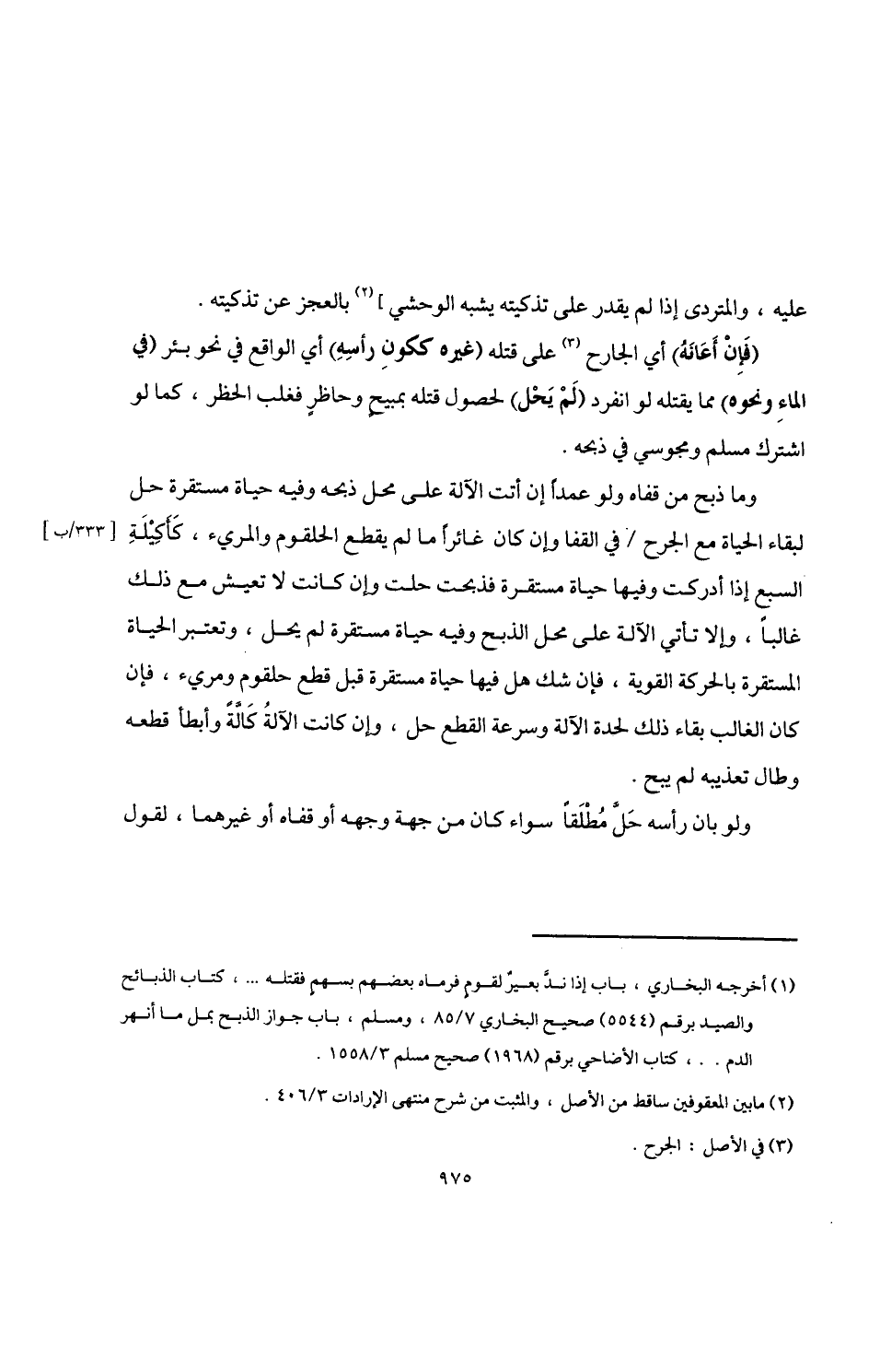 (فَإِنْ أَعَانَهُ) أي الجارح (¬2) على قتله (غيره ككونِ رأسهِ) أي الواقع في نحو بئر (في الماءِ ونحوه) مما يقتله لو انفرد (لَمْ يَحْل) لحصول قتله بمبيحٍ وحاظرٍ فغلب الحظر، كما لو اشترك مسلم ومجوسي في ذبحه.