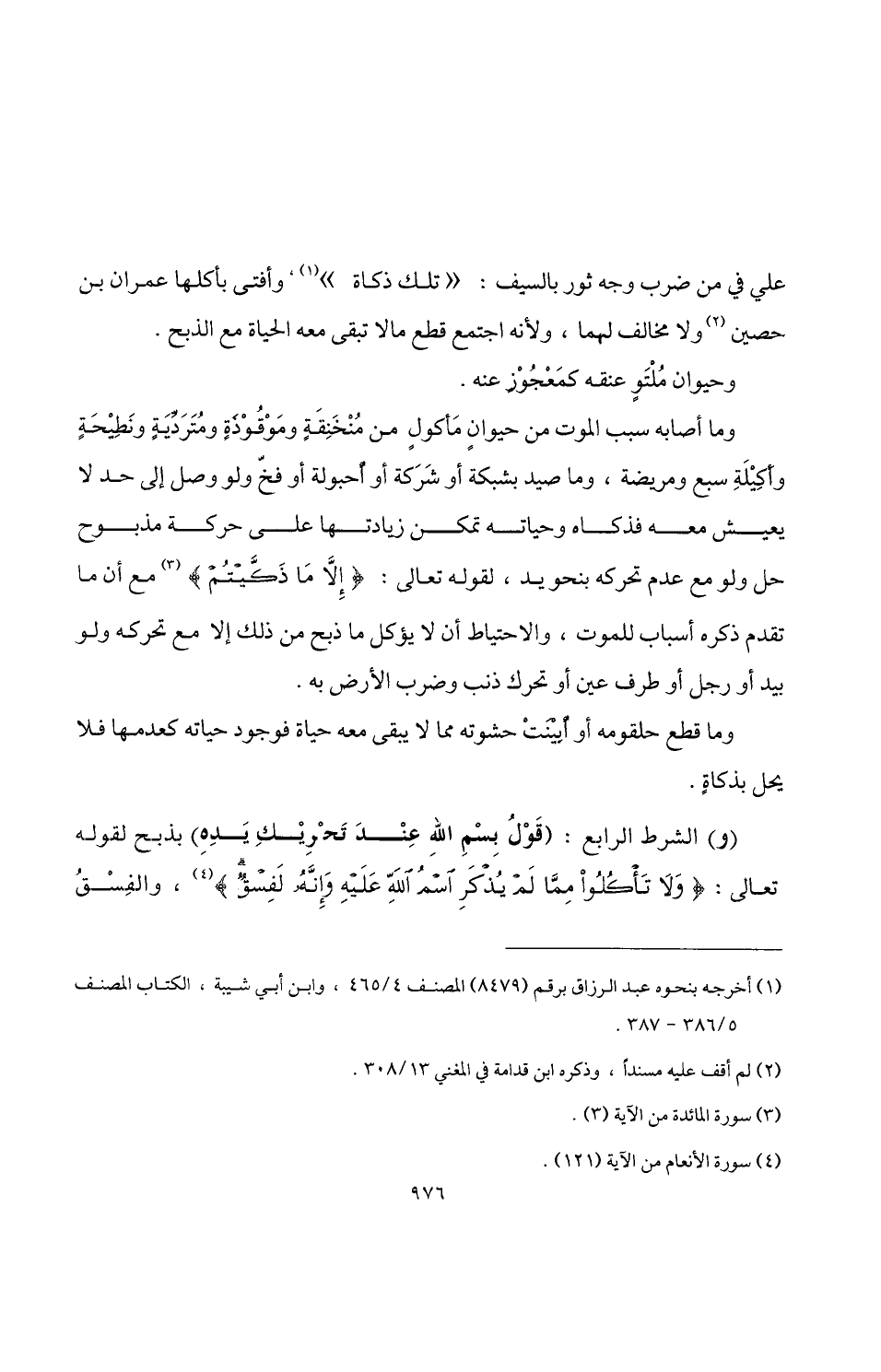 علي في من ضرب وجه ثور بالسيف: "تلك ذكاة" (¬1)، وأفتى بأكلها عمران بن حصين (¬2) ولا مخالف لهما، ولأنه اجتمع قطع ما لا تبقى معه الحياة مع الذبح.