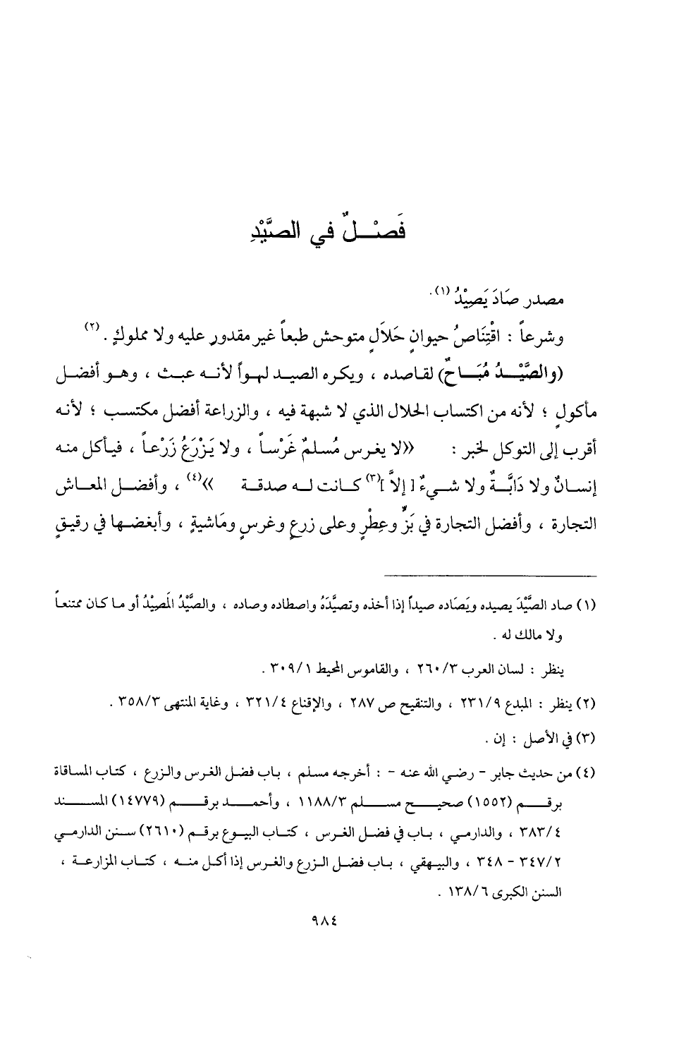 (والصَّيْدُ مُبَاحٌ) لقاصده، ويكره الصيد لهوًا لأنه عبث، وهو أفضل مأكولٍ؛ لأنه من اكتساب الحلال الذي لا شبهة فيه، والزراعة أفضل مكتسب؛ لأنه أقرب إلى التوكل لخبر: "لا يغرس مُسلمٌ غرسًا، ولا يَزْرَعُ زَرْعًا، فيأكل منه إنسانٌ ولا دَابَّةٌ ولا شيءٌ [إلَّا] (¬3) كانت له صدقة" (¬4)، وأفضل المعاش التجارة، وأفضل التجارة في بَزٍّ وعِطْرٍ وعلى زرعٍ وغرسٍ ومَاشيةٍ، وأبغضها في رقيقٍ
