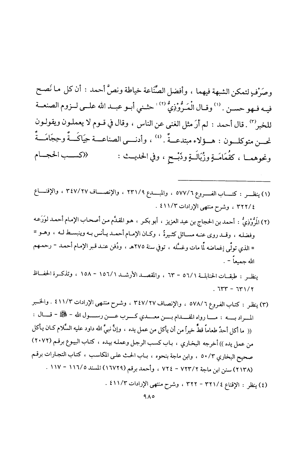 (¬3) ينظر: كتاب الفروع 6/ 578، والإنصاف 27/ 347، وشرح منتهى الإرادات 3/ 411. والخبر المراد به: ما رواه المقدام بن معدي كرب عن رسول اللَّه -صلى اللَّه عليه وسلم- قال: "ما أكل أحدٌ طعامًا قطٌّ خيرًا من أن يأكل من عمل يده، كان نبى اللَّه داود عليه السلام كان يأكل من عمل يده" أخرجه البخاري، باب كسب الرجل وعمله بيده، كتاب البيوع برقم (2072) صحيح البخاري 3/ 50، وابن ماجة بنحوه، باب الحث على المكاسب، كتاب التجارات برقم (2138) سنن ابن ماجة 2/ 723 - 724، وأحمد برقم (16729) المسند 5/ 116 - 117.