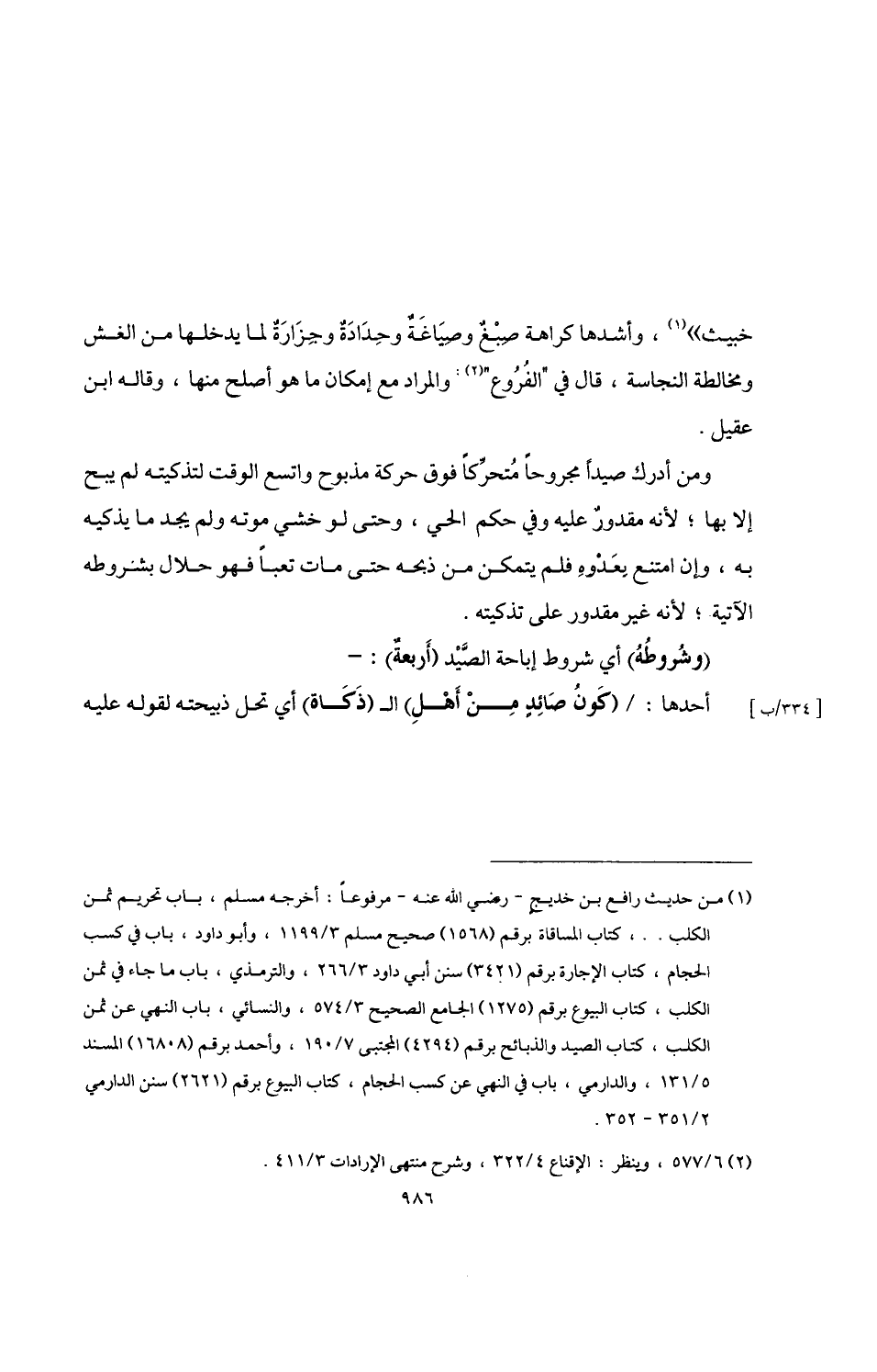 (وشُروطُهُ) أي شروط إباحة الصَّيْد (أَربعةٌ): -