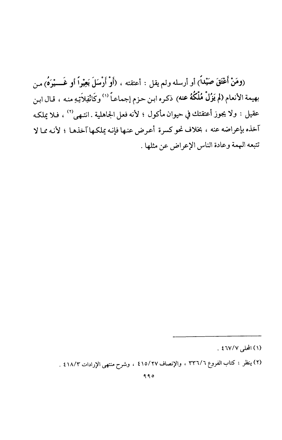 (ومَنْ أَعتَقَ صَيْدًا) أو أرسله ولم يقل: أعتقته، (أَوْ أَرْسَلَ بَعِيْرًا أو غَيْرَهُ) من بهيمة الأنعام (لم يَزُلْ مُلْكُهُ عنه) ذكره ابن حزم إجماعًا (¬1) وكَانْفِلَاتِهِ منه، قال ابن عقيل: ولا يجوز أعتقتك في حيوان مأكول؛ لأنه فعل الجاهلية. انتهى (¬2)، فلا يملكه آخذه بإعراضه عنه، بخلاف نحو كسرة أعرض عنها فإنه يملكها آخذها؛ لأنه مما لا تتبعه الهمة وعادة الناس الإعراض عن مثلها.