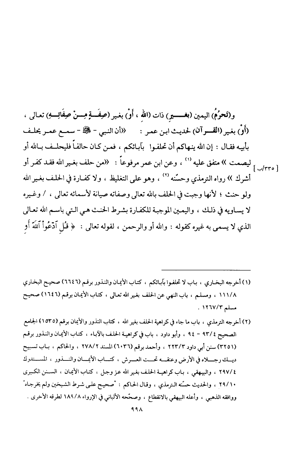 و (تَحرُمُ) اليمين (بغيرِ) ذات (اللَّهِ، أَوْ) بغير (صِفَةِ مِنْ صِفَاتِهِ) تعالى، (أَوْ) بغير (القرآن) لحديث ابن عمر: "أن النبي -صلى اللَّه عليه وسلم- سمع عمر يحلف بأبيه فقال: إن اللَّه ينهاكم أن تحلفوا بآبائكم، فمن كان حالفًا فليحلف باللَّه أو ليصمت" متفق عليه (¬1)، وعن ابن عمر مرفوعًا: "من حلف بغير اللَّه فقد كفر أو أشرك" رواه الترمذي وحسّنه (¬2)، وهو على التغليظ، ولا كفارة في الحلف بغير اللَّه ولو حنث؛ لأنها وجبت في الحلف باللَّه تعالى وصفاته صيانة لأسمائه تعالى، وغيره لا يساويه في ذلك، واليمين الموجبة للكفارة بشرط الحنث هي التي باسم اللَّه تعالى الذي لا يسمى به غيره كقوله: واللَّه أو والرحمن، لقوله تعالى: {قُلِ ادْعُوا اللَّهَ أَوِ