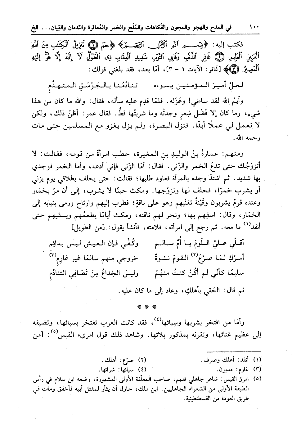 وأما من افتخر بشربها وسبائها ، فقد كانت العرب تفتخر بسبائها ، وتضيفه إلى عظيم غنائها ، وتقرنه بمذكور بلائها . وشاهد ذلك قول امرئ القيس :