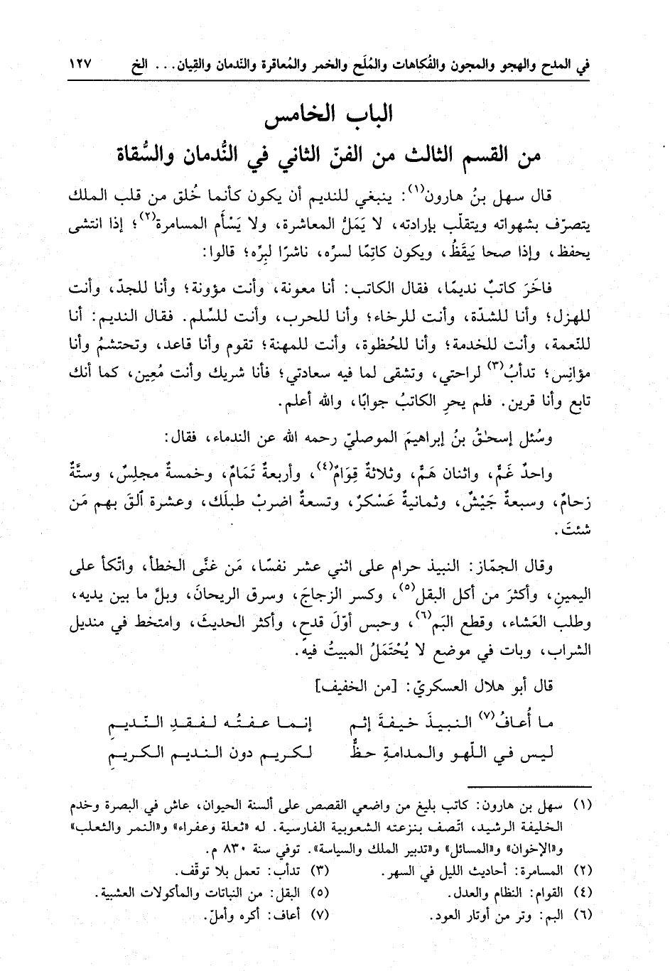 الباب الخامس من القسم الثالث من الفن الثاني في الندمان والسقاة