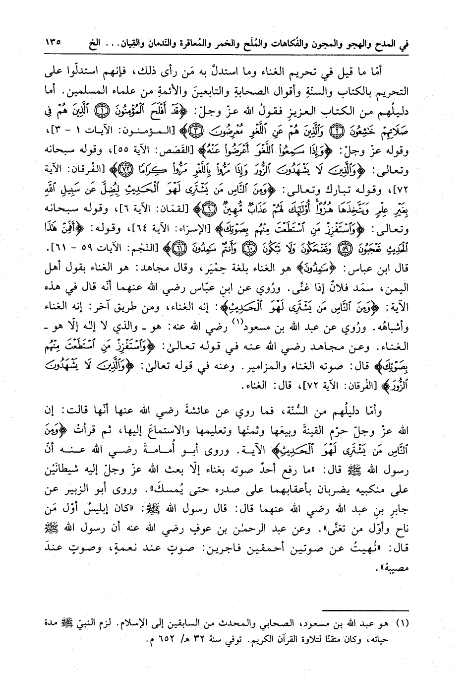 أما ما قيل في تحريم الغناء وما استدل به من رأى ذلك ، فإنهم استدلوا على التحريم بالكتاب والسنة وأقوال الصحابة والتابعين والأئمة من علماء المسلمين . أما دليلهم من الكتاب العزيز فقول الله عز وجل : " قد أفلح المؤمنون الذين هم في صلاتهم خاشعون والذين هم عن اللغو معرضون " . وقوله عز وجل : " وإذا سمعوا اللغو أعرضوا عنه " . وقوله سبحانه وتعالى : " والذين لا يشهدون الزور وإذا مروا باللغو مروا كرماً " . وقوله تبارك وتعالى : " ومن الناس من يشتري لهو الحديث ليضل عن سبيل الله بغير علم ويتخذها هزواً أولئك لهم عذاب مهين " . وقوله سبحانه وتعالى : " واستفزز من استطعت منهم بصوتك " ، وقوله : " أفمن هذا الحديث تعجبون وتضحكون ولا تبكون وأنتم سامدون " . قال ابن عباس : سامدون هو الغناء بلغة حمير ، وقال مجاهد : هو الغناء بقول أهل اليمن ، سمد فلان إذا غنى . وروي عن ابن عباس رضي الله عنهما أنه قال في هذه الآية " ومن الناس من يشتري لهو الحديث " : إنه الغناء ، ومن طريق آخر : إنه الغناء وأشباهه . وروي عن عبد الله بن مسعود رضي الله عنه : هو - والذي لا إله إلا هو - الغناء . وعن مجاهد رضي الله عنه في قوله تعالى : " واستفزز من استطعت منهم بصوتك " قال : صوته الغناء والمزامير . وعنه في قوله تعالى : " والذين لا يشهدون الزور " قال : الغناء .