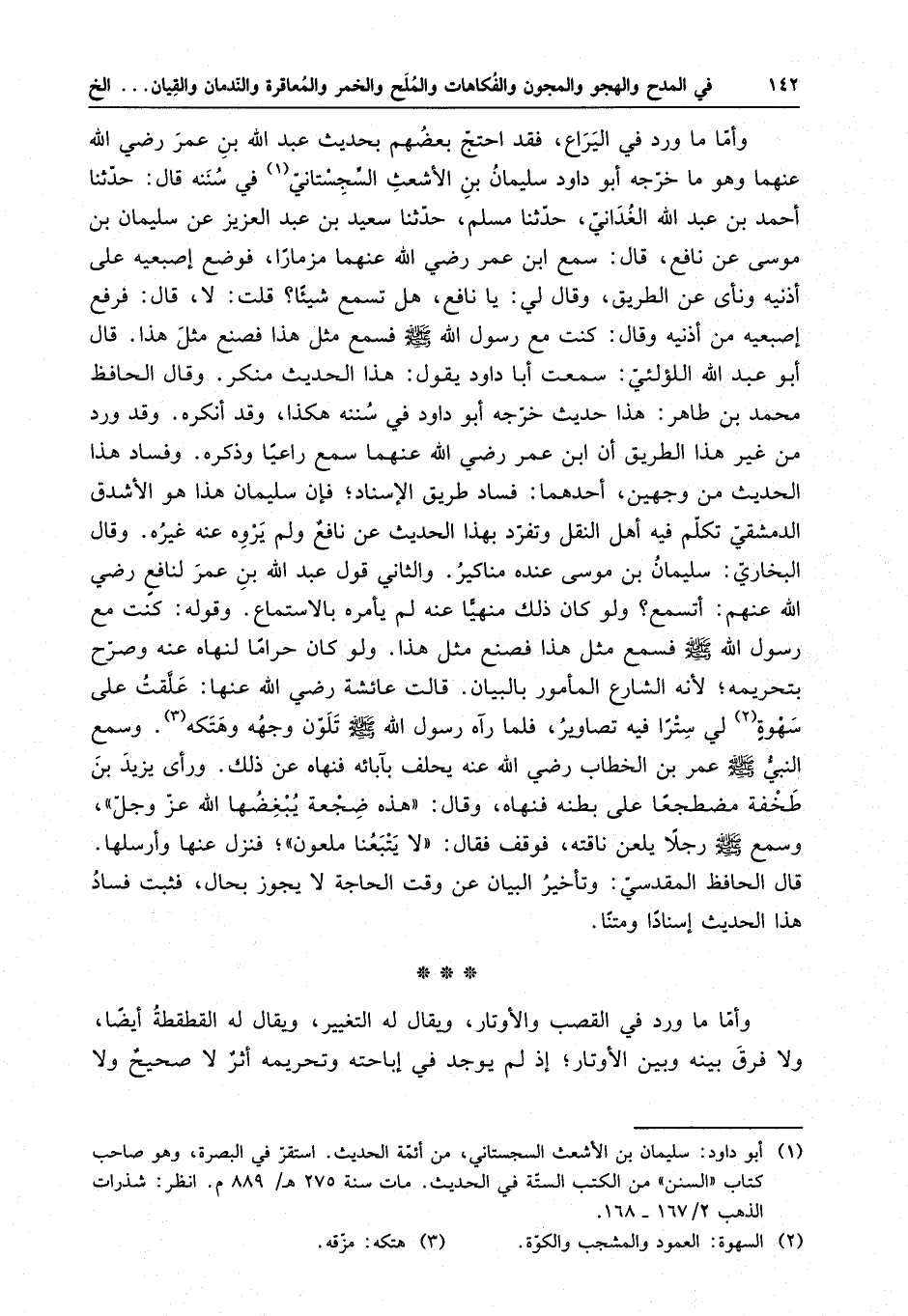 وأما ما ورد في اليراع ، فقد احتج بعضهم بحديث عبد الله بن عمر رضي الله عنهما وهو ما خرجه أبو داود سليمان بن الأشعث السجستاني في سننه قال : حدثنا أحمد بن عبد الله لغداني ، حدثنا مسلم ، حدثنا سعيد بن عبد العزيز عن سليمان بن موسى عن نافع ، قال : سمع ابن عمر رضي الله عنهما مزماراً ، فوضع إصبعيه على أذنيه ونأى عن الطريق ، وقال لي : يا نافع ، هل تسمع شيئاً ؟ قلت لا . قال : فرفع إصبعيه من أذنيه وقال : كنت مع رسول الله ( صلى الله عليه وسلم ) فسمع مثل هذا فصنع مثل هذا . قال أبو عبد الله اللؤلئي : سمعت أبا داود يقول : هذا الحديث منكر . وقال الحافظ محمد بن طاهر : هذا حديث خرجه أبو داود في سننه هكذا وقد أنكره . وقد ورد من غير هذا الطريق أن ابن عمر رضي الله عنهما سمع راعياً وذكره . وفساد هذا الحديث من وجهين : أحدهما فساد طريق الإسناد ، فإن سليمان هذا هو الأشدق الدمشقي تكلم فيه أهل النقل وتفرد بهذا الحديث عن نافع ولم يؤوه عنه غيره . وقال البخاري : سليمان بن موسى عنده مناكير . والثاني قول عبد الله بن عمر رضي الله عنهم : أتسمع ؟ ولو كان ذلك منهياً عنه لم يأمره بالاستماع . وقوله : كنت مع رسول الله ( صلى الله عليه وسلم ) فسمع مثل هذا فصنع مثل هذا . ولو كان حراماً لنهاه عنه وصرح بتحريمه ، لأنه الشارع المأمور بالبيان . قالت عائشة رضي الله عنها : علقت على سهوة لي سراً فيه تصاوير ، فلما رآه رسول الله ( صلى الله عليه وسلم ) تلون وجهه وهتكه . وسمع النبي ( صلى الله عليه وسلم ) عمر بن الخطاب رضي الله عنه يحلف بآبائه فنهاه عن ذلك . ورأى يزيد بن طخفة مضطجعاً على بطنه فنهاه وقال : " هذه ضجعة يبغضها الله عز وجل " . وسمع ( صلى الله عليه وسلم ) رجلاً يلعن ناقته ، فوقف فقال : " لا يتبعنا ملعون " ، فنزل عنها وأرسلها . قال الحافظ المقدسي : وتأخير البيان عن وقت الحاجة لا يجوز بحال ، فثبت فساد هذا الحديث إسناداً ومتناً .