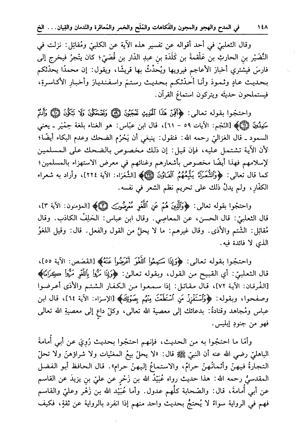 وقال الثعلبي في أحد أقواله عن تفسير هذه الآية عن الكلبي ومقاتل : نزلت في النضير بن الحارث بن علقمة بن كلدة بن عبد الدار بن قصي ، كان يتجر فيخرج إلى فارس فيشتري أخبار الأعاجم فيرويها ويحدث بها قريشاً ويقول : إن محمداً يحدثكم بحديث عاد وثمود وأنا أحدثكم بحديث رستم واسفنديار وأخبار الأكاسرة فيستملحون حديثه ويتركون استماع القرآن . واحتجوا بقوله تعالى : " أفمن هذا الحديث تعجبون وتضحكون ولا تبكون وأنتم سامدون " قال ابن عباس : هو الغناء بلغة حمير ، يعني - السمود - قال الغزالي رحمه الله : فنقول ينبغي أن يحرم الضحك وعدم البكاء أيضاً ، لأن الآية تشتمل عليه ، فإن قيل : إن ذلك مخصوص بالضحك على المسلمين لإسلامهم فهذا أيضاً مخصوص بأشعارهم وغنائهم في معرض الاستهزاء بالمسلمين كما قال تعالى : " والشعراء يتبعهم الغاوون " وأراد به شعراء الكفار ولم يدل ذلك على تحريم نظم الشعر في نفسه .