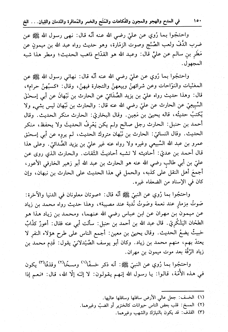 واحتجوا بما روي عن علي رضي الله عنه أنه قال : نهى رسول الله ( صلى الله عليه وسلم ) عن ضرب الدف ولعب الصنج وصوت الزمارة ، وهو حديث رواه عبد الله بن ميمون عن مطر بن سالم عن علي قال : وعبد الله هو القداح ذاهب الحديث ، ومطر هذا شبه مجهول . واحتجوا بما روي عن علي رضي الله عنه أنه قال : نهاني رسول الله ( صلى الله عليه وسلم ) عن المغنيات والنواحات وعن شرائهن وبيعهن والتجارة فيهن وقال : " كسبهن حرام " . قال : وهذا حديث رواه علي بن يزيد الصدائي عن الحارث بن نبهان عن أبي إسحاق السبيعي عن الحارث عن علي رضي الله عنه قال : والحارث بن نبهان ليس بشيء ولا يكتب حديثه قاله يحيى بن معين . وقال البخاري : الحارث منكر الحديث . وقال أحمد بن حنبل : الحارث رجل صالح ولم يكن يعرف الحديث ولا يحفظ ، منكر الحديث . وقال النسائي : الحارث بن نبهان متروك الحديث . لم يروه عن أبي إسحاق عمرو بن عبد الله السبيعي وغيره ولا رواه عنه غير علي بن يزيد الصدائي . وعلى هذا قال أحمد بن عدي : أحاديثه لا تشبه أحاديث الثقات . والحارث الذي روى عن علي بن أبي طالب رضي الله عنه هو الحارث بن عبد الله أبو زهير الخارفي الأعور ، أجمع أهل النقل على كذبه ، والحمل في هذا الحديث على الحارث بن نبهان وإن كان في الإسناد من الضعفاء غيره .