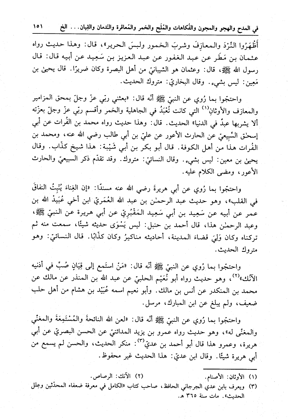 واحتجوا بما روي عن النبي ( صلى الله عليه وسلم ) أنه قال : " لعن الله النائحة والمستمعة والمغني والمغنى له " وهو حديث رواه عمرو بن يزيد المدائني عن الحسن البصري عن أبي هريرة ، وعمرو هذا قال أبو أحمد بن عدي : منكر الحديث ، والحسن لم يسمع من أبي هريرة شيئاً . وقال ابن عدي : هذا الحديث غير محفوظ .