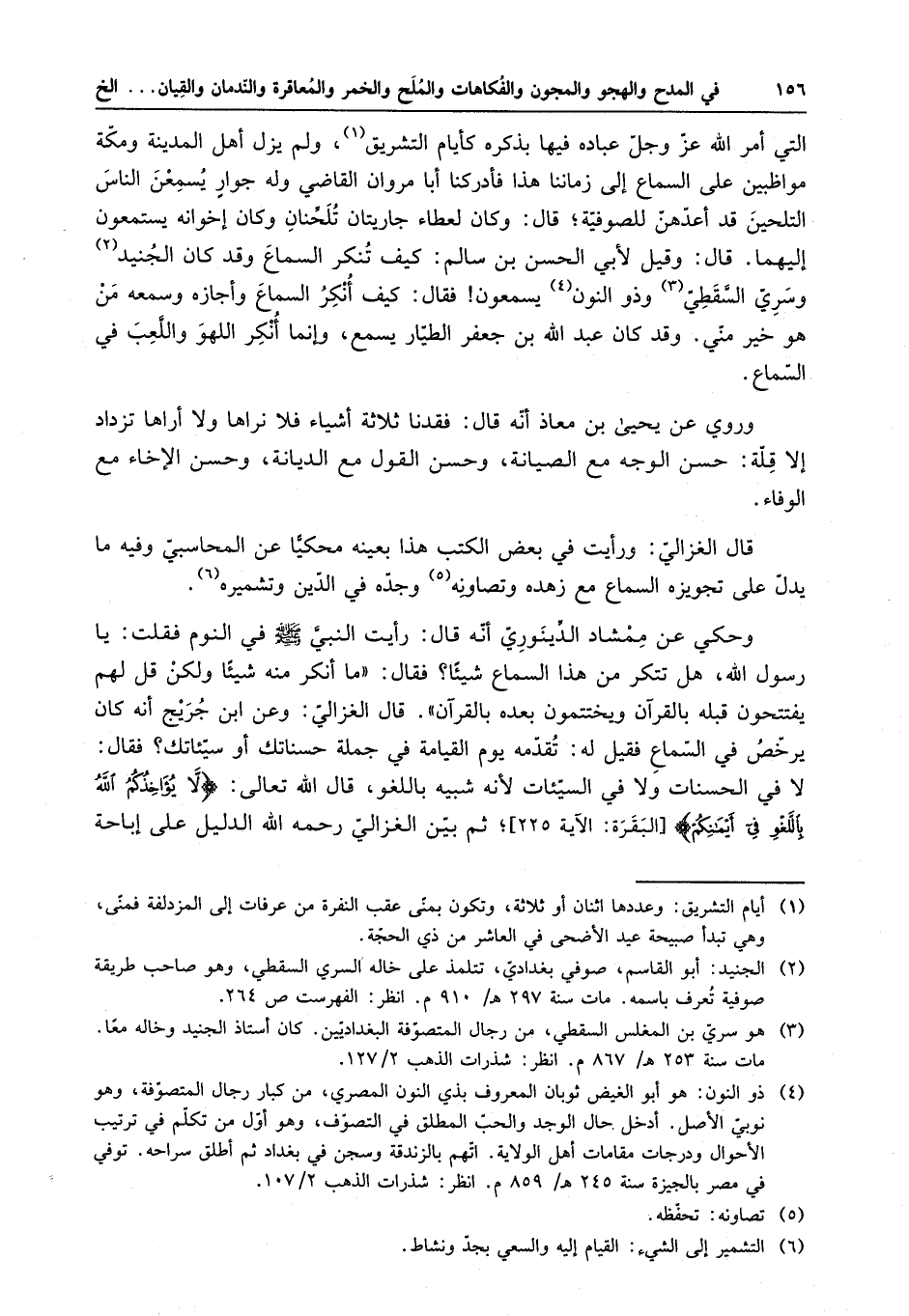 التي أمر الله عز وجل عباده فيها بذكره كأيام التشريق . ولم يزل أهل المدينة ومكة مواظبين على السماع إلى زماننا هذا فأدركنا أبا مروان القاضي وله جوار يسمعن الناس التلحين قد أعدهن للصوفية . قال : وكان لعطاء جاريتان تلحنان وكان إخوانه يستمعون إليهما . قال : وقيل لأبي الحسن بن سالم : كيف تنكر السماع وقد كان الجنيد وسري السقطي وذو النون يسمعون فقال : كيف أنكر السماع وأجازه وسمعه من هو خير مني . وقد كان عبد الله بن جعفر الطيار يسمع . وإنما أنكر اللهو واللعب في السماع .
