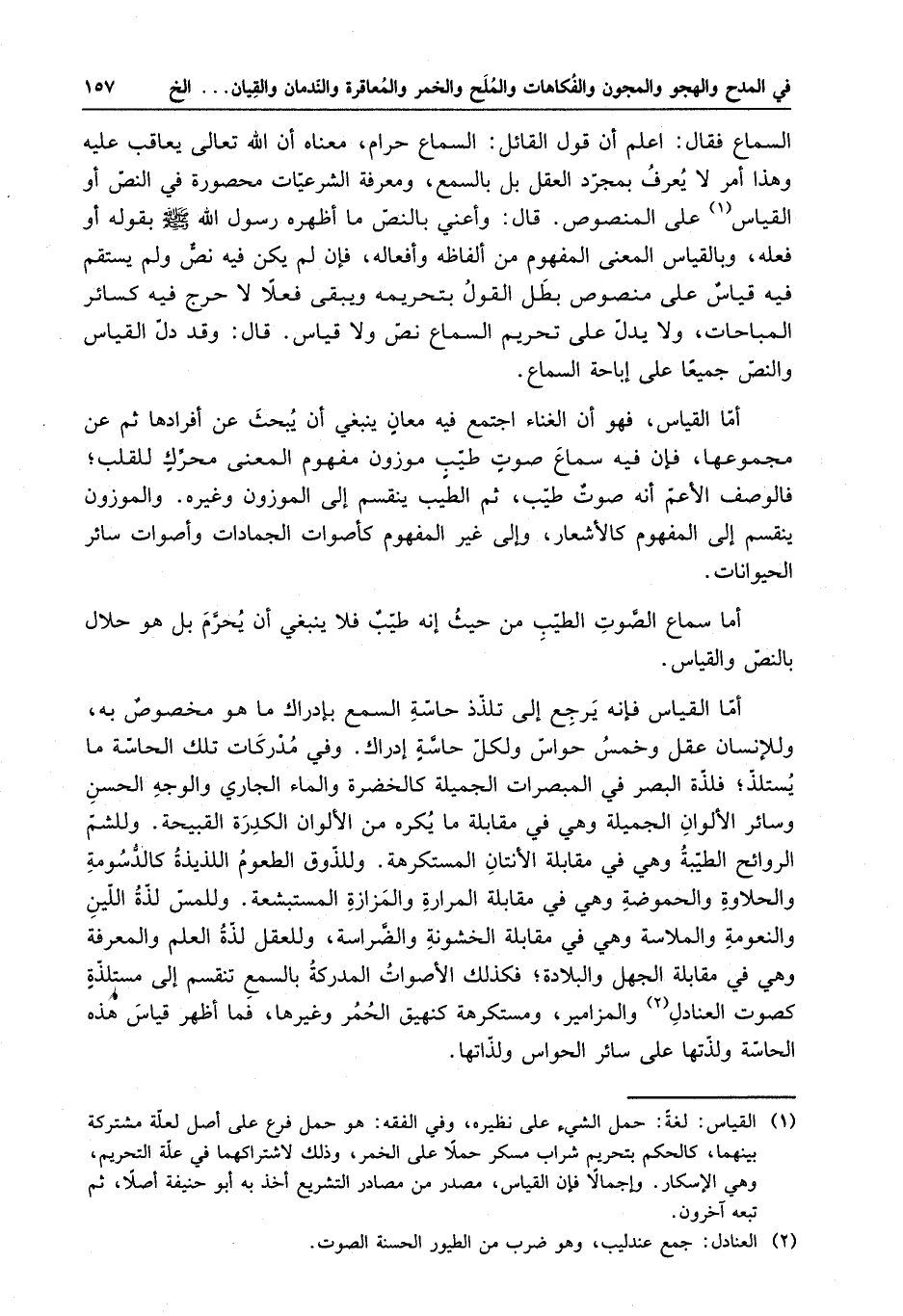 أما القياس فإنه يرجع إلى تلذذ حاسة السمع بإدراك ما هو مخصوص به . وللإنسان عقل وخمس حواس ولكل حاسة إدراك . وفي مدركات تلك الحاسة ما يستلذ . فلذة البصر في المبصرات الجميلة كالخضرة والماء الجاري والوجه الحسن وسائر الألوان الجميلة وهي في مقابلة ما يكره من الألوان الكدرة القبيحة . وللشم الروائح الطيبة وهي في مقابلة الأنتان المستكرهة . وللذوق الطعوم اللذيذة كالدسومة والحلاوة والحموضة وهي في مقابلة المرارة والمزازة المستبشعة . وللمس لذة اللين والنعومة والملاسة وهي في مقابلة الخشونة والضراسة . وللعقل لذة العلم والمعرفة وهي في مقابلة الجهل والبلادة . فكذلك الأصوات المدركة بالسمع تنقسم إلى مستلذة كصوت العنادل والمزامير ، ومستكرهة كنهيق الحمر وغيرها ، فما أظهر قياس هذه الحاسة ولذتها على سائر الحواس ولذاتها .