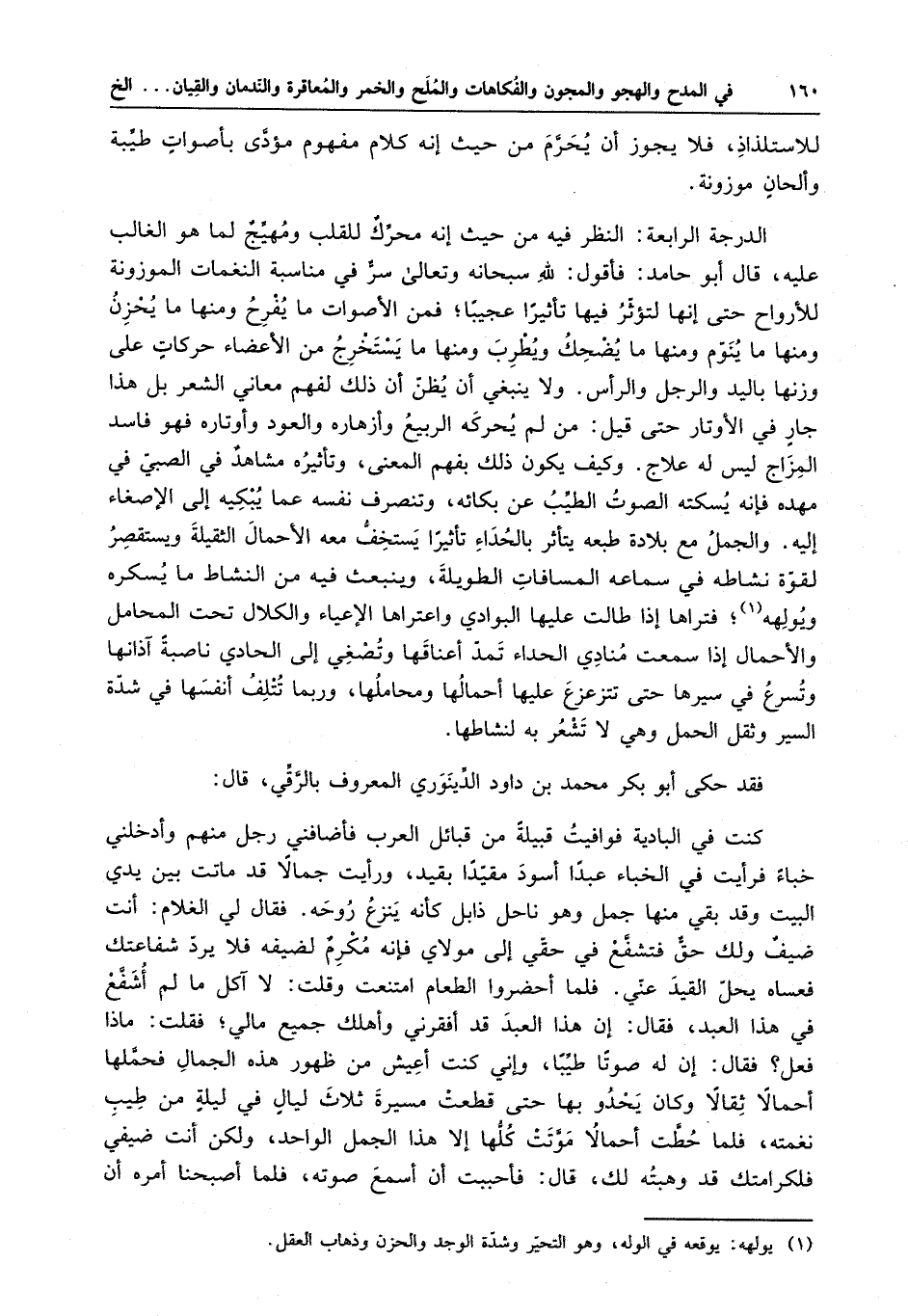 فقد حكى أبو بكر محمد بن داود الدينوري المعروف بالرقي ، قال : كنت في البادية فوافيت قبيلة من قبائل العرب فأضافني رجل منهم وأدخلني خباء فرأيت في الخباء عبداً أسود مقيداً بقيد ، ورأيت جمالاً قد ماتت بين يدي البيت وقد بقي منها جمل وهو ناحل ذابل كأنه ينزع روحه . فقال لي الغلام : أنت ضيف ولك حق فتشفع في حقي إلى مولاي فإنه مكرم لضيفه فلا يرد شفاعتك فعساه يحل القيد عني . فلما أحضروا الطعام امتنعت وقلت : لا آكل ما لم أشفع في هذا العبد ، فقال : إن هذا العبد قد أفقرني وأهلك جميع مالي ، فقلت : ماذا فعل ؟ فقال : إن له صوتاً طيباً ، وإني كنت أعيش من ظهور هذه الجمال فحملها أحمالاً ثقالاً وكان يحدو بها حتى قطعت مسيرة ثلاث ليال في ليلة من طيب نغمته فلما حطت أحمالها موتت كلها إلا هذا الجمل الواحد ، ولكن أنت ضيفي فلكرامتك قد وهبته لك قال : فأحببت أن أسمع صوته ، فلما أصبحنا أمره أن