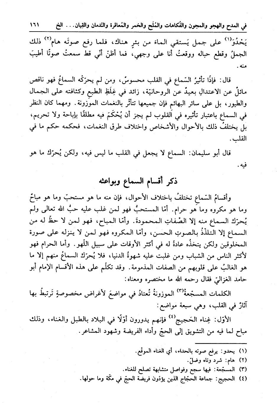 وأقسام السماع تختلف باختلاف الأحوال : فإن منه ما هو مستحب وما هو مباح وما هو مكروه وما هو حرام . أما المستحب فهو لمن غلب عليه حب الله تعالى ولم يحرك السماع منه إلا الصفات المحمودة . وأما المباح فهو لمن لاحظ له من السماع إلا التلذذ بالصوت الحسن ، وأما المكروه فهو لمن لا ينزله على صورة المخلوقين ولكن يتخذه عادة في أكثر الأوقات على سبيل اللهو . وأما الحرام فهو لأكثر الناس من الشباب ومن غلبت عليه شهوة الدنيا فلا حرك السماع منهم إلا ما هو الغالب على قلوبهم من الصفات المذمومة . وقد تكلم على هذه الأقسام الإمام أبو حامد الغزالي فقال رحمه الله ما مختصره ومعناه : الكلمات المسجعة الموزونة تعتاد في مواضع لأغراض مخصوصة ترتبط بها آثار في القلب وهي سبعة مواضع : الأول : غناء الحجيج فإنهم يدورون أولاً في البلاد بالطبل والغناء وذلك مباح لما فيه من التشويق إلى الحج وأداء الفريضة وشهود المشاعر .