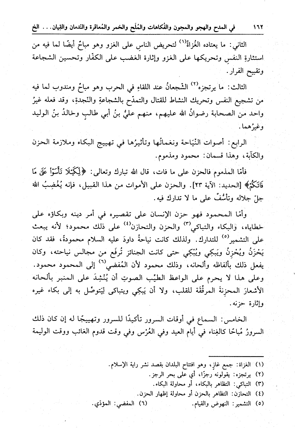 وأما المحمود فهو حزن الإنسان على تقصيره في أمر دينه وبكاؤه على خطاياه . والبكاء والتباكي والحزن والتحازن على ذلك محمود لأنه يبعث على التشمير للتدارك . ولذلك كانت نياحة داود عليه السلام محمودة ، فقد كان يحزن ويحزن ويبكي ويبكي حتى كانت الجنائز ترفع من مجالس نياحته وكان يفعل ذلك بألفاظه وألحانه ، وذلك محمود لأن المفضي إلى المحمود محمود . وعلى هذا لا يحرم على الواعظ الطيب الصوت أن ينشد على المنبر بألحانه الأشعار المحزنة المرققة للقلب ولا أن يبكي ويتباكى ليتوصل به إلى بكاء غيره وإثارة حزنه .