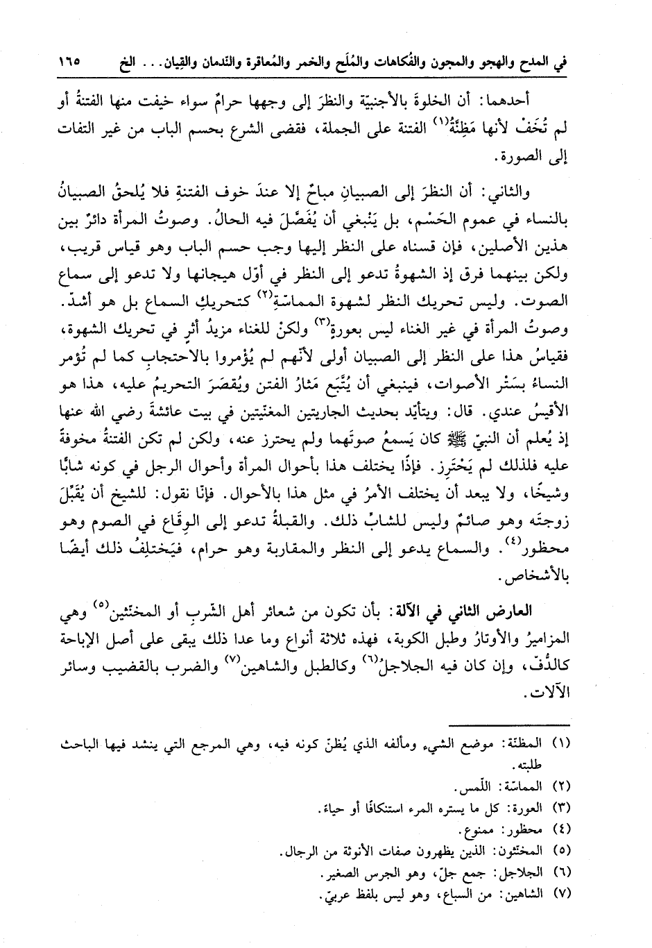 العارض الثاني : في الآلة بأن تكون من شعائر أهل الشرب أو المخنثين وهي المزامير والأوتار وطبل الكوبة ، فهذه ثلاثة أنواع وما عدا ذلك يبقى على أصل الإباحة كالدف وإن كان فيه الجلاجل وكالطبل والشاهين والضرب بالقضيب وسائر الآلات .