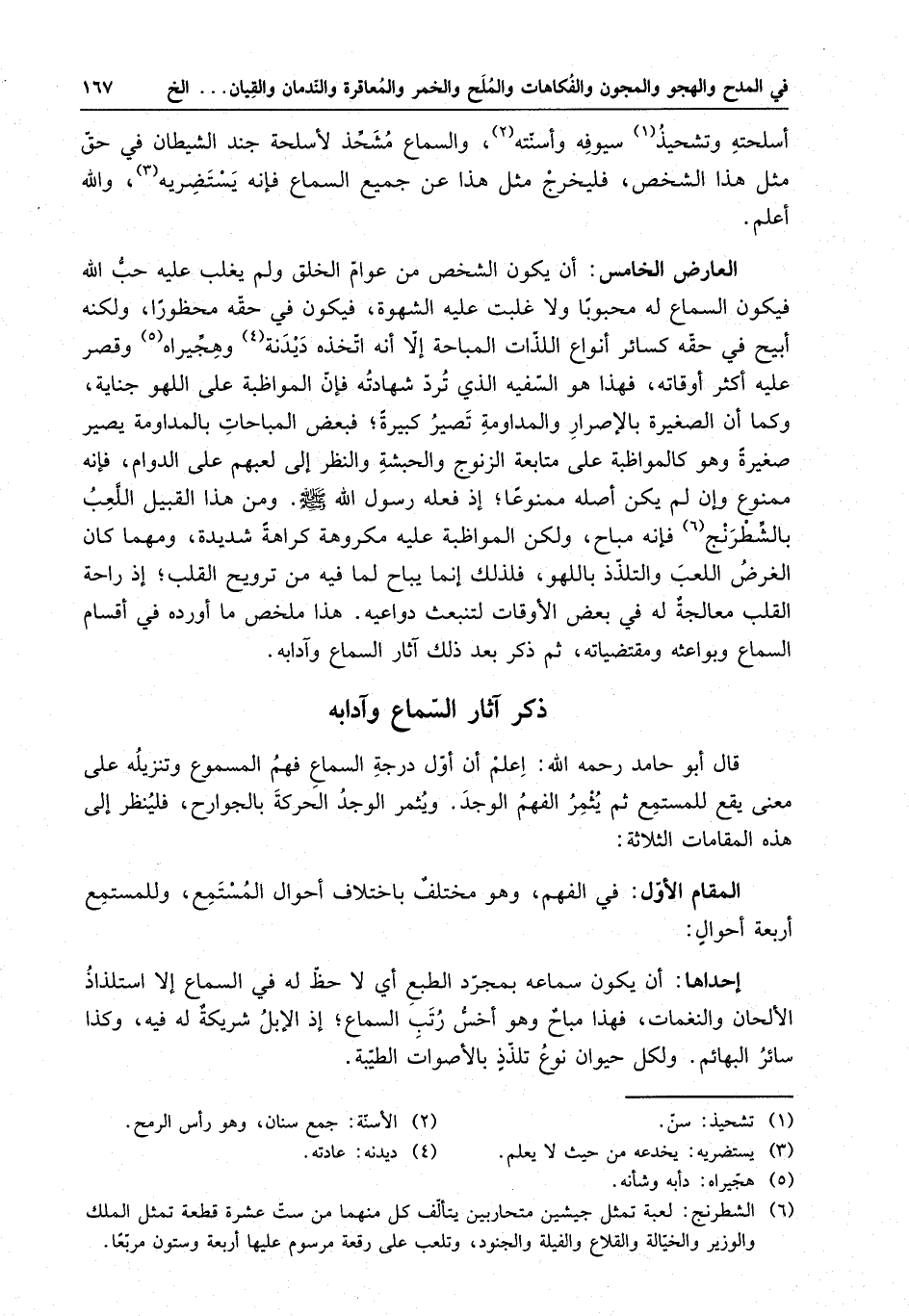 العارض الخامس : أن يكون الشخص من عوام الخلق ولم يغلب عليه حب الله فيكون السماع له محبوباً ولا غلبت عليه الشهوة فيكون في حقه محظوراً ، ولكنه أبيح في حقه كسائر أنواع اللذات المباحة إلا أنه اتخذه ديدنه وهجيراه وقصر عليه أكثر أوقاته ، فهذا هو السفيه الذي ترد شهادته فإن المواظبة على اللهو جناية . وكما أن الصغيرة بالإصرار والمداومة تصير كبيرة ، فبعض المباحات بالمداومة يصير صغيرة وهو كالمواظبة على متابعة الزنوج والحبشة والنظر إلى لعبهم على الدوام فإنه ممنوع وإن لم يكن أصله ممنوعاً إذا فعله رسول الله ( صلى الله عليه وسلم ) . ومن هذا القبيل اللعب بالشطرنج فإنه مباح ، ولكن المواظبة عليه مكروهة كراهة شديدة ، ومهما كان الغرض معالجة له في بعض الأوقات لتنبعث دواعيه . هذا ملخص ما أورده في أقسام السماع وبواعثه ومقتضياته ، ثم ذكر بعد ذلك آثار السماع وآدابه .