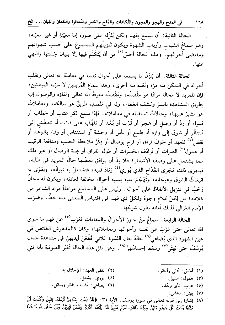 الحالة الثانية : أن يسمع بفهم ولكن ينزله على صورة إما معينة أو غير معينة وهو سماع الشباب وأرباب الشهوة ويكون تنزيلهم المسموع على حسب شهواتهم ومقتضى أحوالهم . وهذه الحالة أخس من أن تكلم فيها إلا ببيان خستها والنهى عنها . الحالة الثالثة : أن ينزل ما يسمعه على أحوال نفسه في معاملة الله تعالى وتقلب أحواله في التمكن منه مرة وبعده منه أخرى ، وهذا سماع المريدين لا سيما المبتدئين . فإن للمريد لا محالة مراداً هو مقصده ، ومقصده معرفة الله تعالى ولقاؤه والوصول إليه بطريق المشاهدة بالسر وكشف الغطاء ، وله في مقصده طريق هو سالكه ، ومعاملات هو مثابر عليها ، وحالات تستقبله في معاملاته . فإذا سمع ذكر عتاب أو خطاب أو قبول أو رد أو وصل أو هجر أو قرب أو بعد أو تلهف على فائت أو تعطش إلى منتظر أو شوق إلى وارد أو طمع أو يأس أو وحشة أو استئناس أو وفاء بالوعد أو نقض للعهد أو خوف فراق أو فرح بوصال أو ذكر ملاحظة الحبيب ومدافعة الرقيب أو همول العبرات أو ترادف الحسرات أو طول الفراق أو عدة الوصال أو غير ذلك مما يشتمل على وصفه الأشعار ، فلا بد أن يوافق بعضها حال المريد في طلبه ، فيجري ذلك مجرى القداح الذي يوري زناد قلبه ، فتشتعل به نيرانه ، ويقوى به انبعاث الشوق وهيجانه ، وتهجم عليه بسببه أحوال مخالفة لعاداته ، ويكون له مجال رحب في تنزيل الألفاظ على أحواله . وليس على المستمع مراعاة مراد الشاعر من كلامه ، بل لكل كلام وجوه ولكل ذي فهم في اقتباس المعنى منه حظ . وضرب الإمام الغزالي لذلك أمثلة يطول شرحها .
