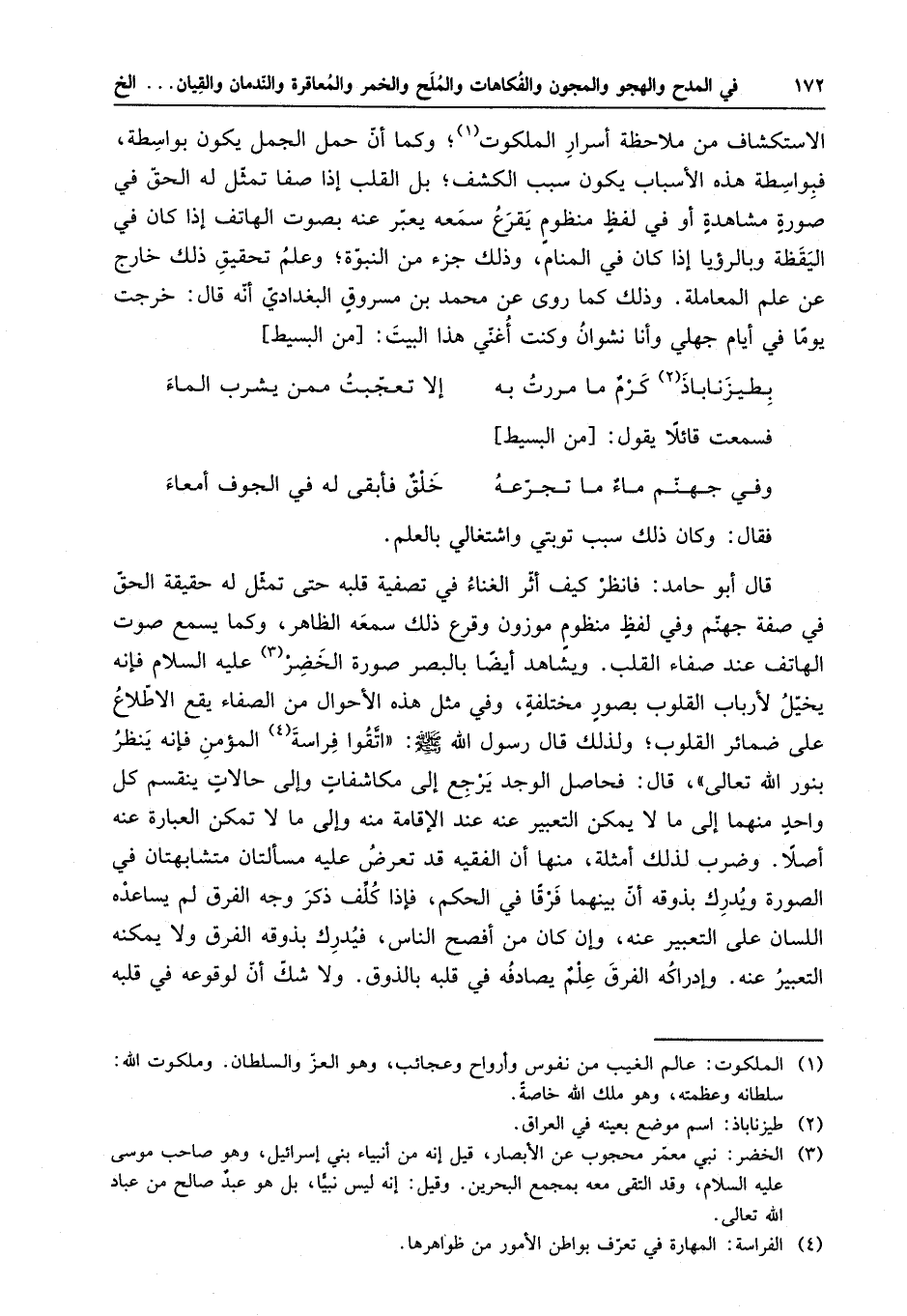 فقال : وكان ذلك سبب توبتي واشتغالي بالعلم . قال أبو حامد : فانظر كيف أثر الغناء في تصفية قلبه حتى تمثل له حقيقة الحق في صفة جهنم وفي لفظ منظوم موزون وقرع ذلك سمعه الظاهر . وكما يسمع صوت الهاتف عند صفاء القلب . ويشاهد أيضاً بالبصر صورة الخضر عليه السلام فإنه يخيل لأرباب القلوب بصور مختلفة ، وفي مثل هذه الأحوال من الصفاء يقع الاطلاع على ضمائر القلوب ، ولذلك قال رسول الله ( صلى الله عليه وسلم ) : " اتقوا فراسة المؤمن فإنه ينظر بنور الله تعالى " . قال : فحاصل الوجد يرجع إلى مكاشفات وإلى حالات ينقسم كل واحد منهما إلى ما لا يمكن التعبير عنه عند الإقامة منه وإلى ما لا تمكن العبارة عنه أصلاً . وضرب لذلك أمثلة ، منها أن الفقيه قد تعرض عليه مسألتان متشابهتان في الصورة ويدرك بذوقه أن بينهما فرقاً في الحكم ، فإذا كلف ذكر وجه الفرق لم يساعده اللسان على التعبير عنه وإن كان من أفصح الناس ، فيدرك بذوقه الفروق ولا يمكنه التعبير عنه ، وإدراكه الفرق علم يصادفه في قلبه بالذوق . ولا شك أن لوقوعه في قلبه