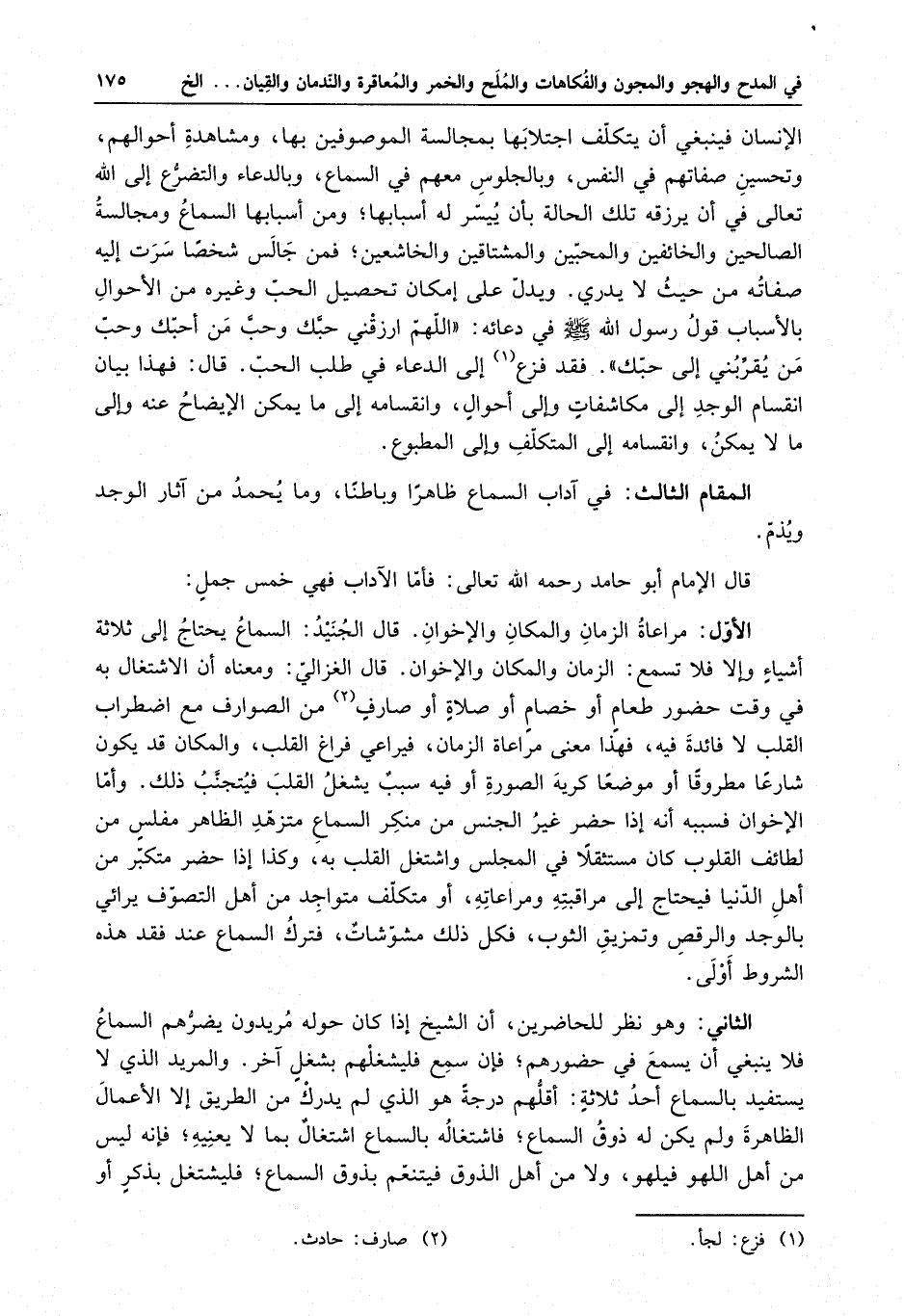 المقام الثالث : في آداب السماع ظاهراً وباطناً ، وما يحمد من آثار الوجد ويذم .